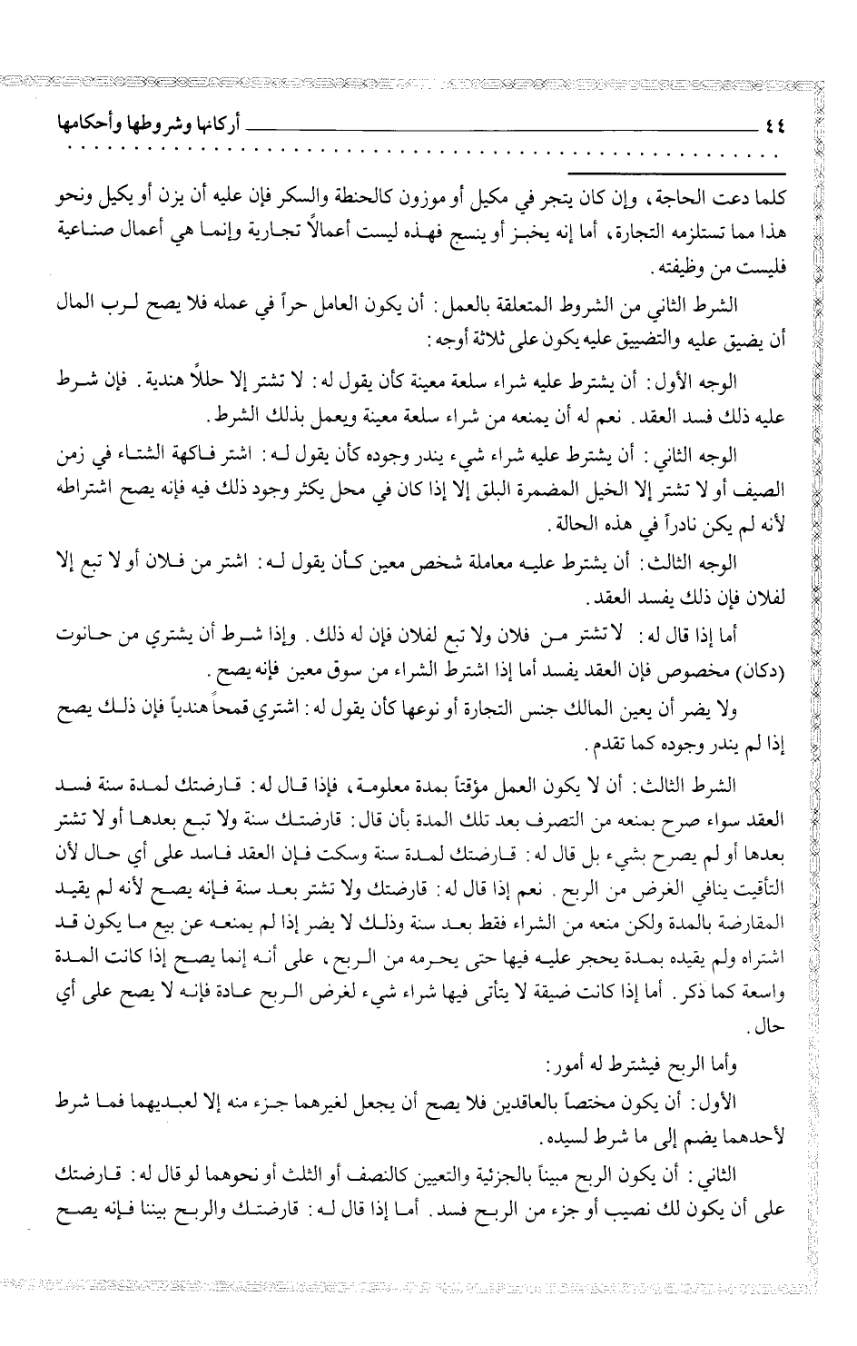 بل قال له: قارضتك لمدة سنة وسكت فإن العقد فاسد على أي حال لأن التأقيت ينافي الغرض من الربح. نعم إذا قال: قارضتك ولا تشتري بعد سنة فإنه يصح لأنه لم يقيض المقارضة بالمدة ولكن منعه من الشراء فقط بعد سنة وذلك لا يضر إلا إذا لم يمنعه عن بيع ما يكون قد اشتراه ولم يفيده بمدة يحجر عليه فيها يحرمه من الربح على انه إنما يصح إذا كانت المدة واسعة كما ذكر. أما إذا كانت ضيقة لا يأتي فيها شراء شيء لغرض الربح عادة فإنه لا يصح على أي حال وأما الربح فيشترط له أمور:
