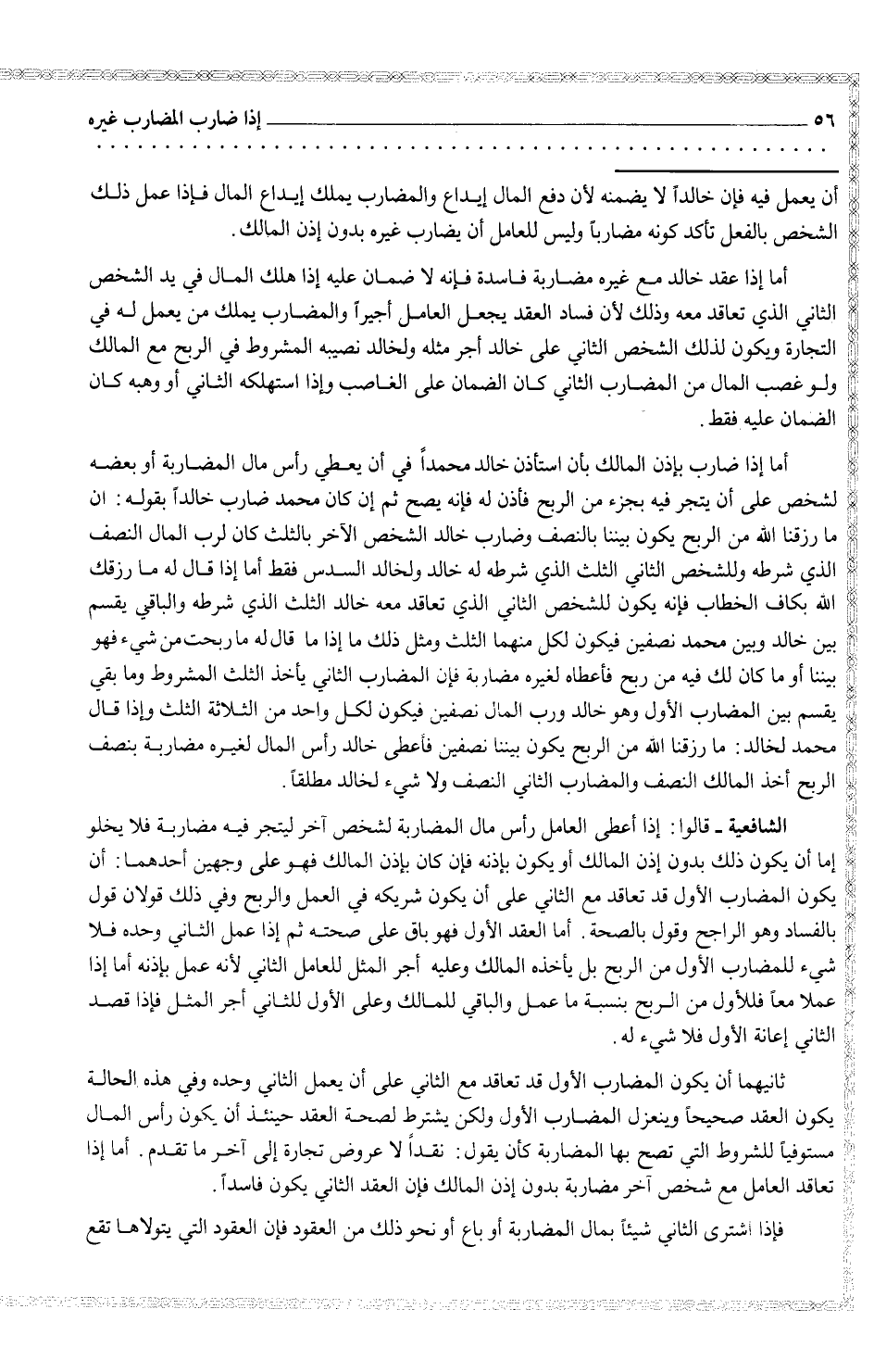 أما إذا ضارب بإذن المالك بأن استأذن خالد محمداً في أن يعطي رأس مال المضاربة أو بعضه لشخص على أن يتجر فيه بجزء من الربح فأذن له فإنه يصح ثم إن كان محمد ضارب خالداً بقوله: ان ما رزقنا الله من الربح يكون بيننا بالنصف وضارب خالد الشخص الآخر بالثلث كان لرب المال الذي شرطه وللشخص الثاني الثلث الذي شرطه له خالد ولخالد السدس فقط أما إذا قال له ما رزقك الله بكاف الخطاب فإنه يكون للشخص الثاني الذي تعاقد معه خالد الثلث الذي شرطه والباقي يقسم بين خالد وبين محمد نصفين وبين فيكون لكل منهما الثلث ومثل ذلك ما إذا ما قال له ما ربحت من شيء فهو بيننا أو ما كان لك فيه من ربح فأعطاه لغيره مضاربة فإن المضارب الثاني بأخذ الثلث المشروط وما بقي يقسم بين المضارب الأول وهو خالد ورب المال نصفين فيكون لكل واحد من الثلاثة الثلث وإذا قال يقسم لخالد: ما رزقنا الله من الربح يكون بيننا نصفين فأعطى خالد رأس المال لغيره مضاربة بنصف الربح أخذ المالك النصف والمضارب الثاني النصف ولا شيء لخالد مطلقاً.