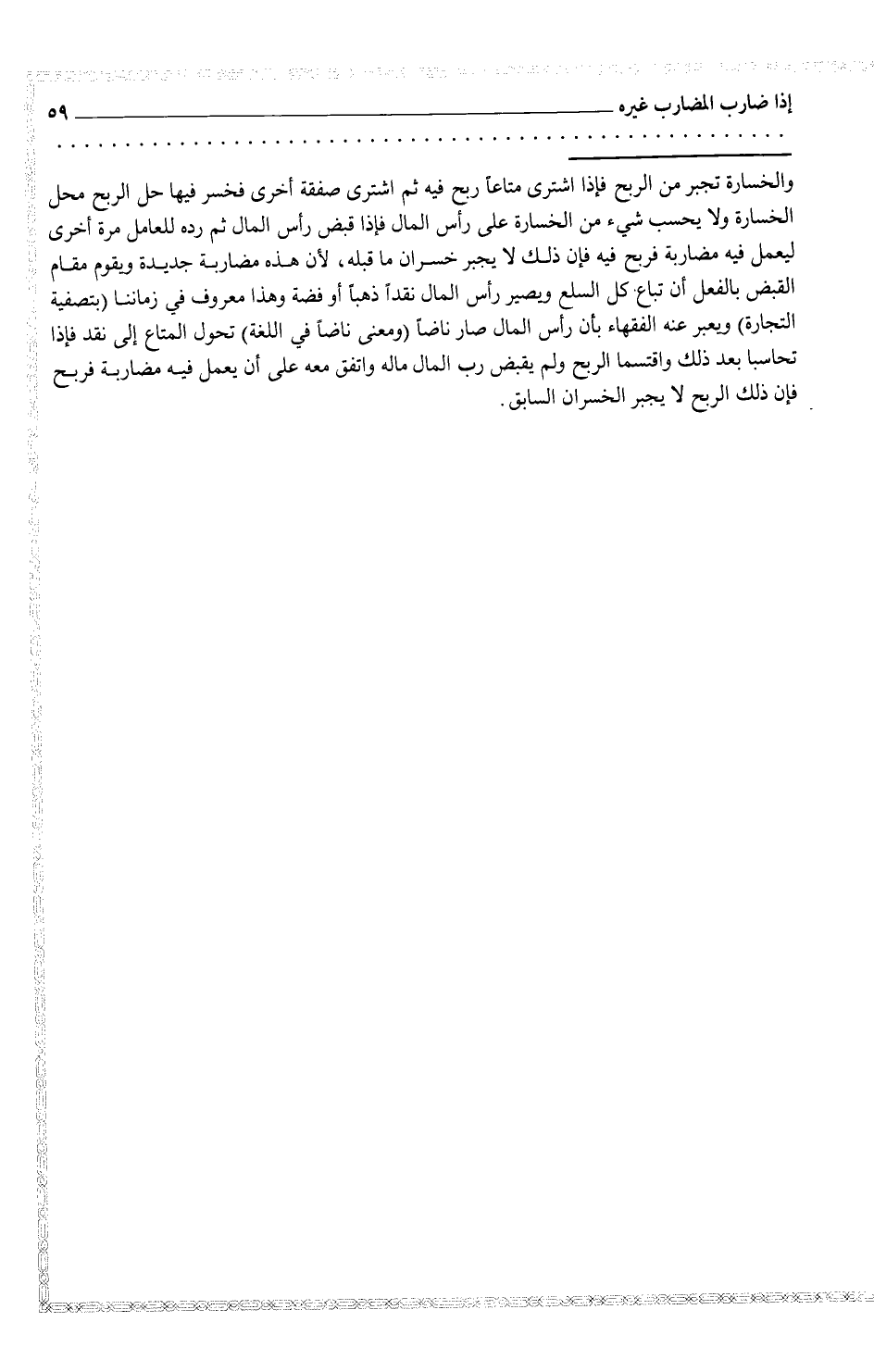 والخسارة تجبر من الربح فإذا اشترى متاعاً ربح فيه ثم اشترى صفقة أخرى فخسر فيها حل الربح محل الخسارة ولا يحسب شيء من الخسارة على رأس المال فإذا قبض رأس المال ثم رده للعامل مرة أخرى ليعمل فيه مضاربة فربح فيه فإن ذلك لا يجبر خسران ما قبله، لأن هذه مضاربة جديدة ويقوم مقام القبض بالفعل أنة تباع كل السلع ويصير رأس المال نقداً أو فضة وهذا معروف في زماننا (بتصفية التجارة) ويعبر عنه الفقهاء بأن رأس المال صار ناضاً (ومعنى ناضاً في اللغة) تحول المتاع إلى نقد فإذا تحاسبا بعد ذلك واقتسما الربح ولم يقبض رب المال ماله واتفق معه على أن يعمل فيه مضاربة فربح فإن ذلك الربح لا يجبر الخسران السابق) .