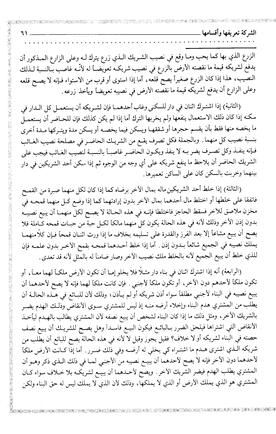 (الثالثة) إذا خلط أحد الشريكين ماله بمال الآخر برضاه كما إذا كان لكل منهما صبرة من القمحب فاتفقا على خلطها أو اختلط مال أحدهما بمال الآخر بدون إرادتهما كما إذا وضع كل منهما قمحه في مخزن ملاصق للآخر فسقط الحاجز فاختلطا فإنه في هذه الحالة لا يصح لكل مهما أن يبيع نصيبه بدون إذن الآخر وذلك لأنه في هذه الحالة يكون منهما مالكاً لكل حبة من حبات قمحه كاملة فلا يصح أن يبيع مشاعاً إلا بعد الفرز والقدرة على تسليمه بخلاف ما إذا ورث اثنان قمحاً فإن كلاً منهما يملك نصيبه في الجميع شائعاً بدون إذن. أما إذا خلط أحدهما قمحه بقمح الآخر بدون عمله فإن للذي خلط أن يبيع الجميع لأنه بالخلط ملك نصيب الآخر وصار ضاكناً له بالمثل لأنه قد تعدى.