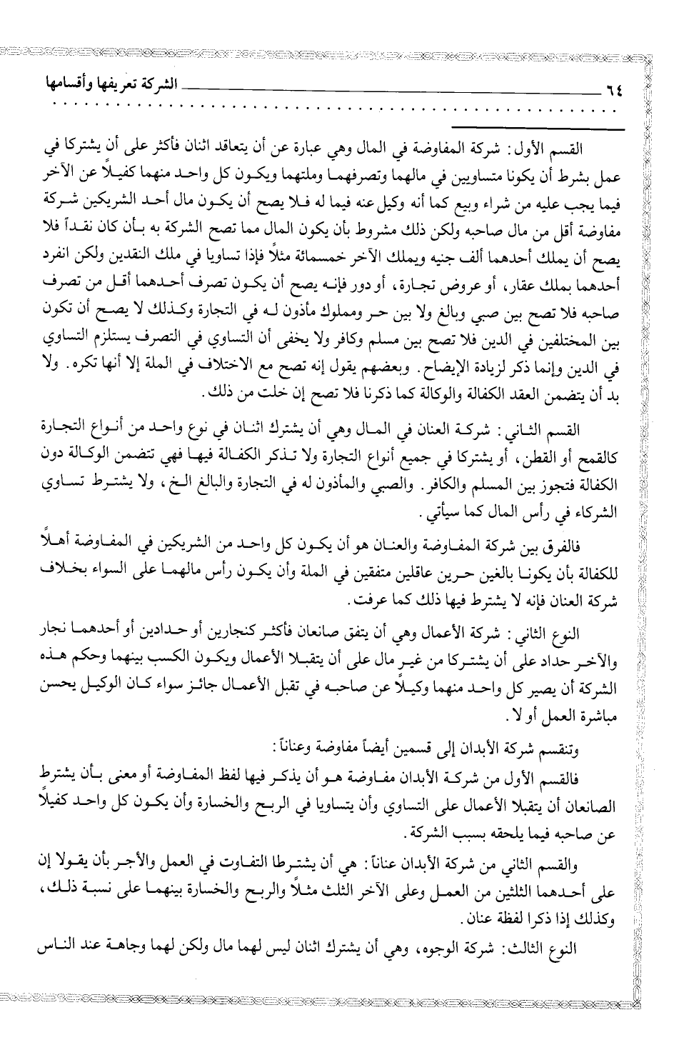 القسم الأول: شركة المفاوضة في المال وهي عبارة عن أن يتعاقد اثنان فأكثر أن يشتركا في عمل بشرط أن يكونا متساويين في مالهما وملتهما ويكون كل واحد منهما كفيلاً عن الآخر فيما يجب عليه من شراء وبيع كما أنه وكيل عنه فيما له فلا تصح أن يكون مال أحد الشريكين شركة مفاوضة أقل من مال صاحبه ولكن مشروط بأن يكون المال مما تصح الشركة به بأن كان نقداً فلا يصح أن يملك أقل مال صاحبه ولكن ذلك مشروط بأن يكون المال مما تصح الشركة به بأن كان نقداً فلا يصح أن يملك أحدهما ألف جنيه ويملك الآخر خمسمائة مثلاً فإذا تساويا في ملك النقدين ولكن انفرد أحدهما بملك عقار، أو عروض تجارة، أو دور فإنه يصح أن يكون تصرف أحدهما أقل من تصرف صاحبه فلا تصح بين صبي وبالغ ولا بين مسلم وكافر ولا يخفى أن التساوي في التصرف يستلزم التساوي في الدين وإنما ذكر لزيادة الإيضاح. وبعضهم يقول إنه تصح مع الاختلاف في الملة إلا أنها تكره. ولا بد أن يتضمن العقد الكفالة والوكالة كما ذكرنا فلا تصح إن خلت من ذلك.