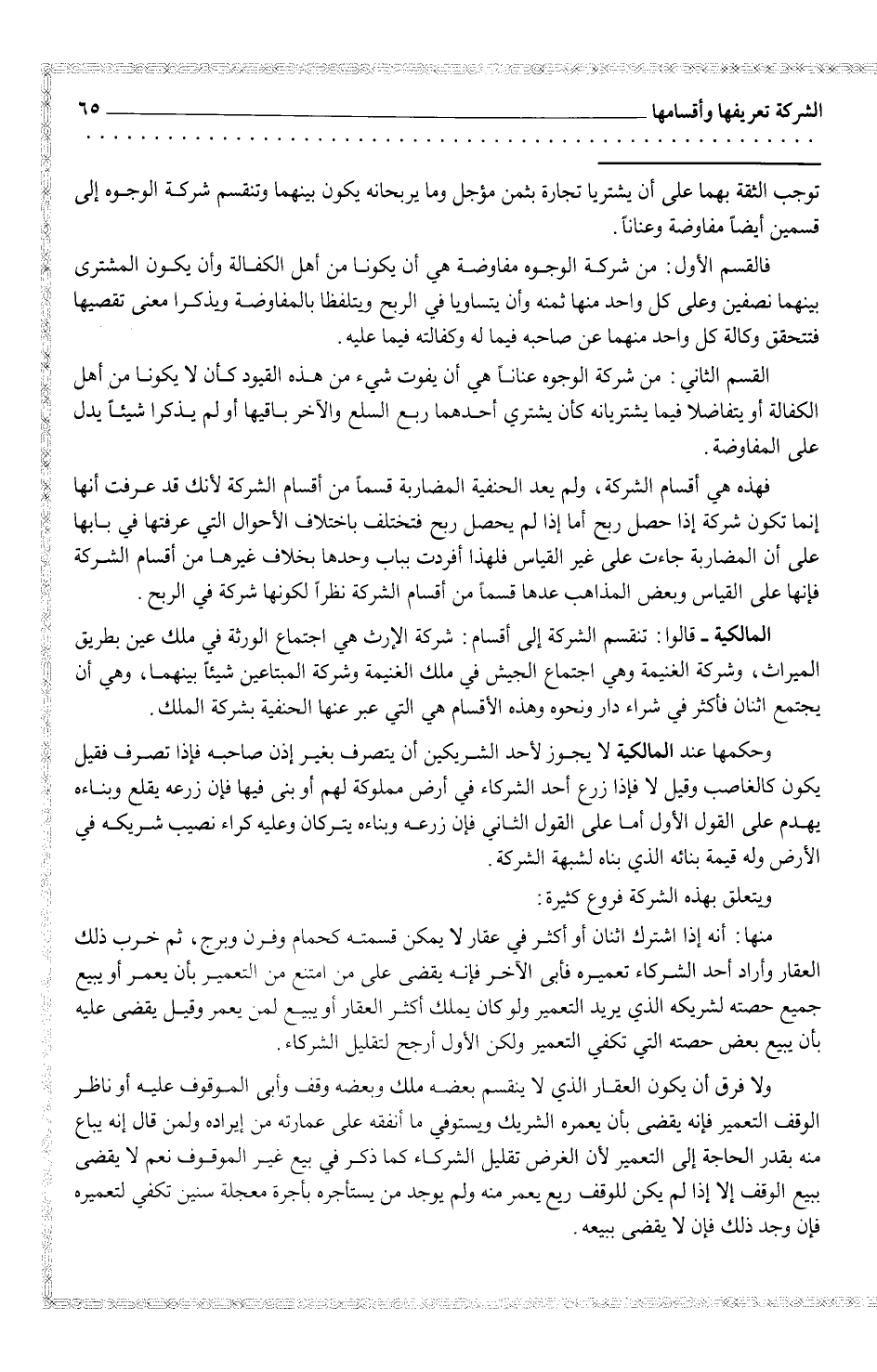 فهذه هي أقسام الشركة، ولم يعد الحنيفية المضاربة قسماً من أقسام الشركة لأنك قد عرفت أنها إنما تكون شركة إذا حصل ربح أما إذا لم يحصل ربح فتختلف الأحوال التي عرفتها في بابها على المضاربة جاءت على غير القياس فلهذا أفردت بباب وحدها بخلاف غيرها من أقسام الشركة فإنها على القياس وبعض المذاهب عدها قسماً من أقسام الشركة نظراً لكونها شركة في الربح.