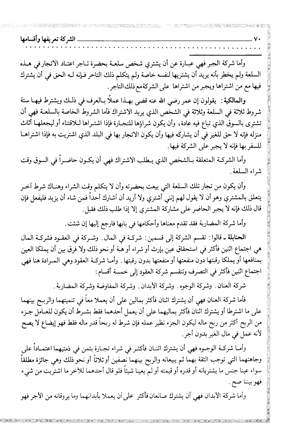 وأما شركة الجبر فهي عبارة عن أن يشتري شخص سلعة بحضرة تاجر اعتاد الاتجار في هذه السلعة ولم يخطر بأنه بشتريها لنفسه خاصة ولم يتكلم ذلك التاجر فإنه له الحق في أن يشترك فيها مع من اشتراها ويجبر من اشتراها على الشركة مع ذلك التاجر.