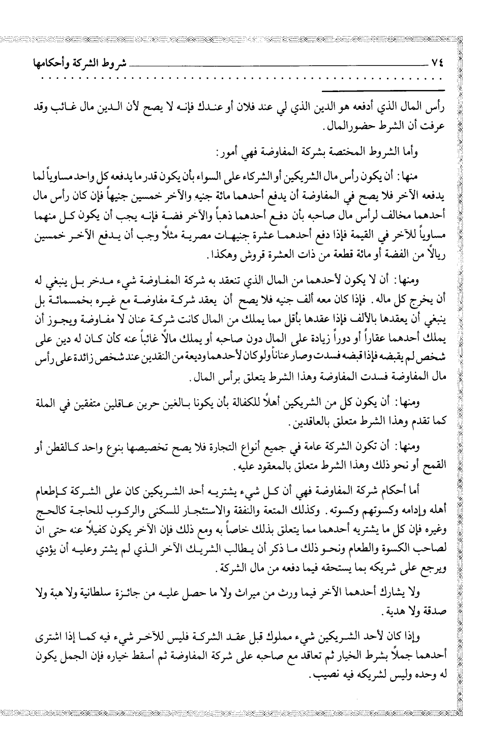 منها: أن يكون رأس مال الشريكين أو الشركاء على السواء بأن يكون قدر ما يدفعه كل واحد مساوياً لما يدفعه الآخر فلا يصح في المفاوضة أن يدفع أحدهما مائة جنيه والآخر خمسين جنيهاً فإن كان رأس مال أحدهما مخالف لرأس مال صاحبه بأن دفع أحدهما ذهباً والآخر فضة وجب أن يكون كل منهما مساوياً للآخر في القيمة فإنه يجب أن يكون كل منهما مساوياً للآخر في القيمة فإذا دفع أحدهما عشرة جنيهات مصرية مثلاً وجب أن يدفع الآخر خمسين ريالاً من الفضة أو مائة قطعة من ذات العشرة قروش وهكذا.
