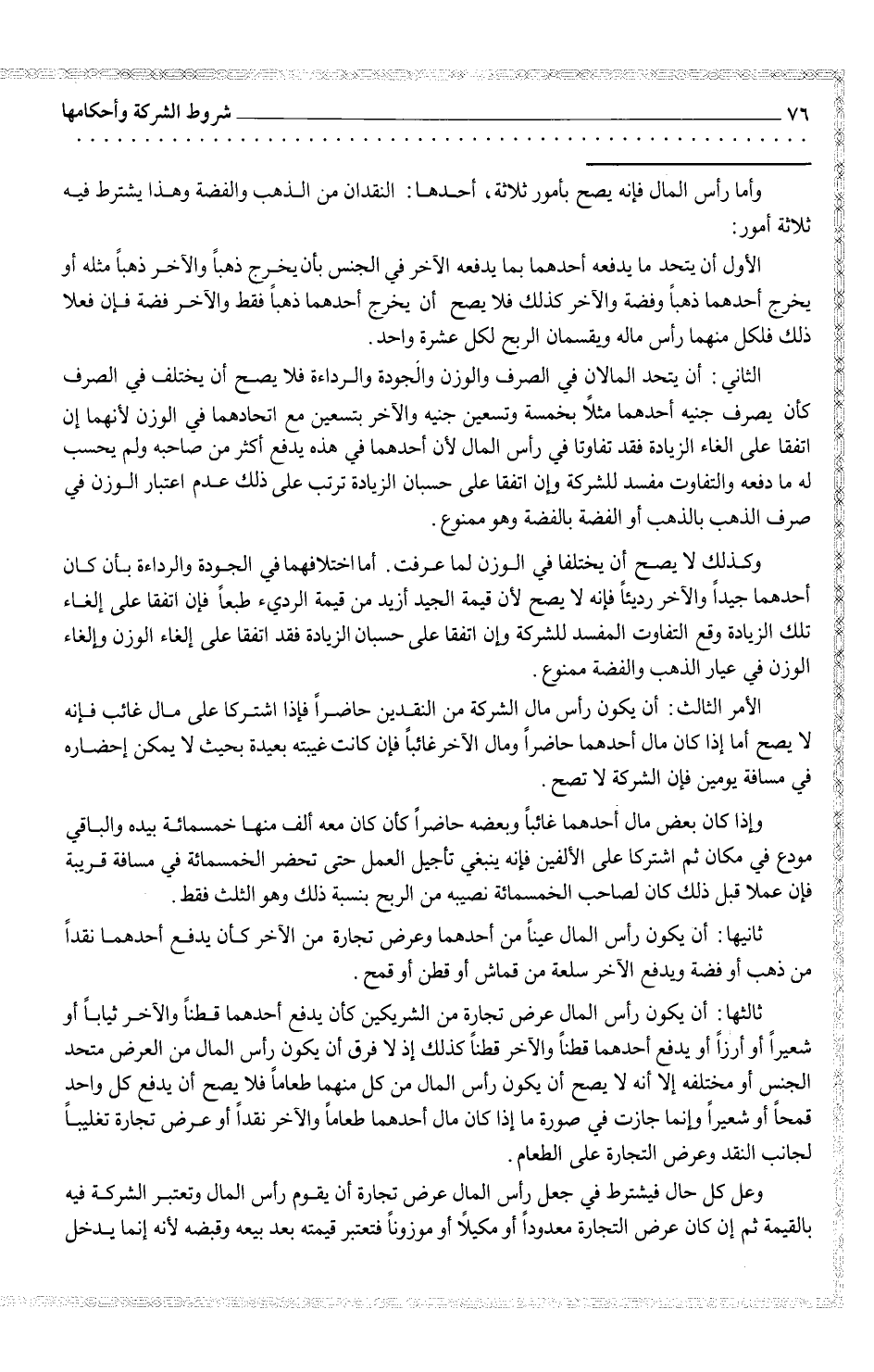 ثالثها: أن يكون رأس المال عرض تجارة من الشركين كأن يدفع أحدهما قطناً والآخر ثياباً أو شعيراً أو أرزاً أو يدفع أحدهما قطناً والآخر قطناً كذلك إذ فرق أن يكون رأس المال من العرض متحد الجنس أو مختلفة إلا أنه لا يصح أن يكون رأس المال من كل منهما طعاماً فلا يصح أن يدفع كل واحد قمحاً أو شعيراً وإنما جازت في صورة ما إذا كان أحدهما طعاماً فلا يصح أن يدفع كل واحد قمحاً أو شعيراً وإنما جازت في صورة ما إذا كان مال أحدهما طعاماً والآخر عرض تجارة تغلباً لجانب النقد وعرض التجارة على الطعام.