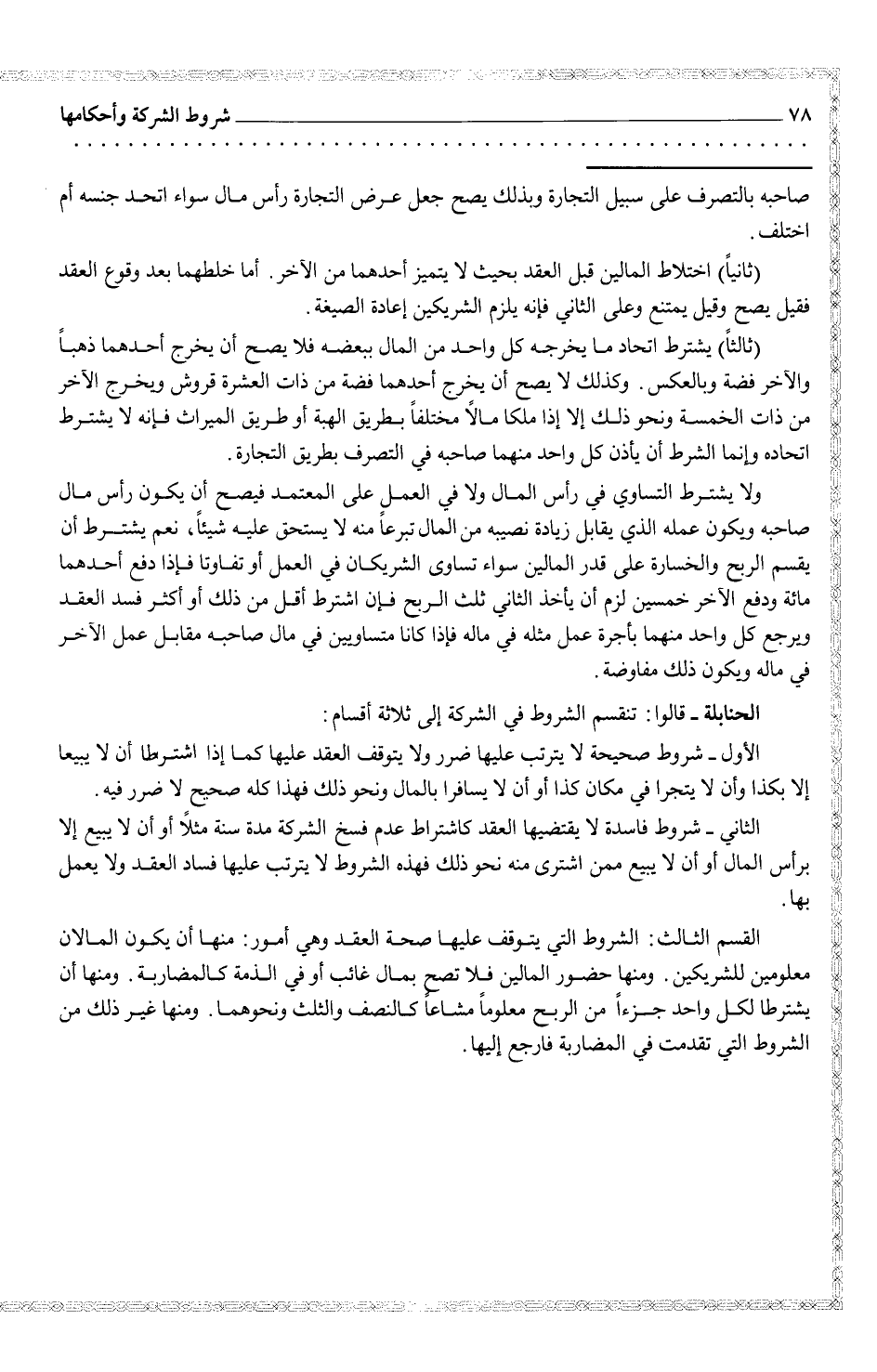 الحنابلة - قالوا: تنقسم الشروط في الشركة إلى ثلاثة أقسام: