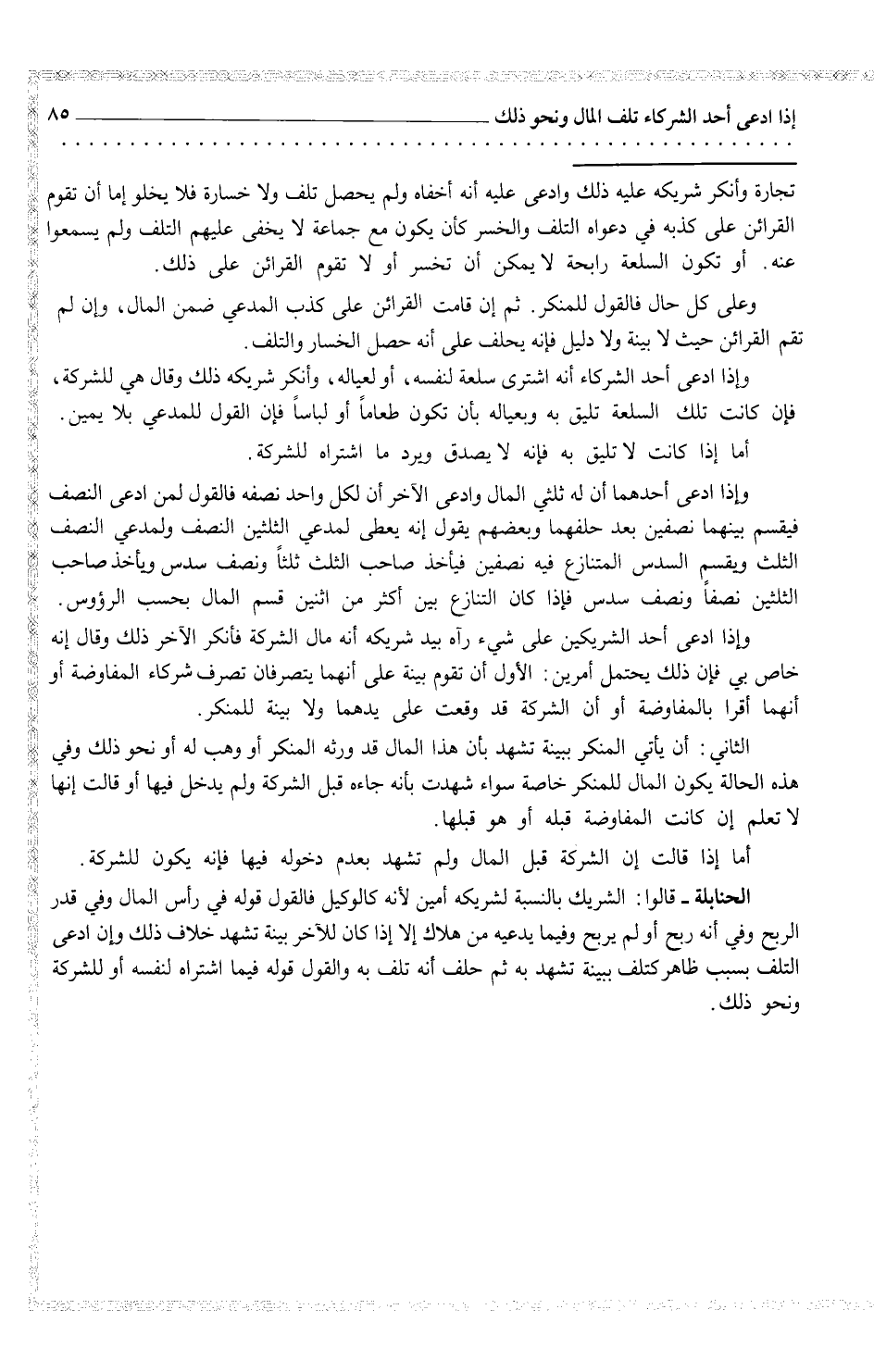 وإذا ادعى أحد الشريكين على شيء رآه بيد شريكه أنه مال الشركة فأنكر الآخر ذلك وقال إنه خاص بي فإن ذلك يحتمل أمرين: الأول أن تقوم بينه على أنهما يتصرفان تصرف شركاء المفاوضة أو لأنهما أقرا بالمفاوضة أو أن الشركة قد وقعت يدهما ولا بينه للمنكر.