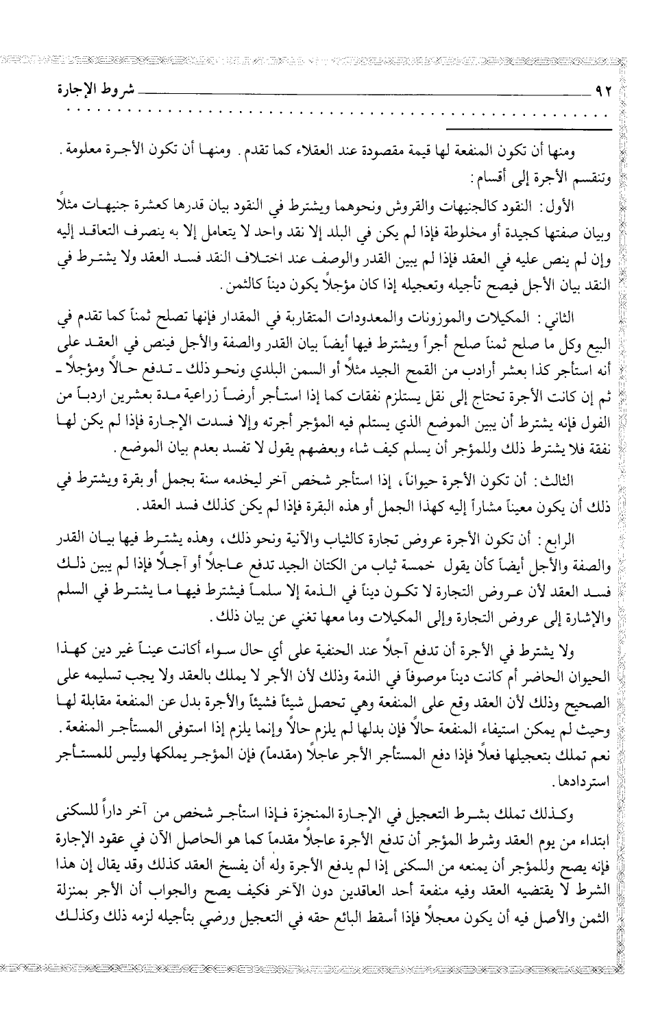 ومنها أن تكون المنفعة لها قيمة مقصودة عند العقلاء كما تقدم. ومنها أن تكون الأجرة معلومة وتنقسم الأجرة إلى ثلاثة أقسام: