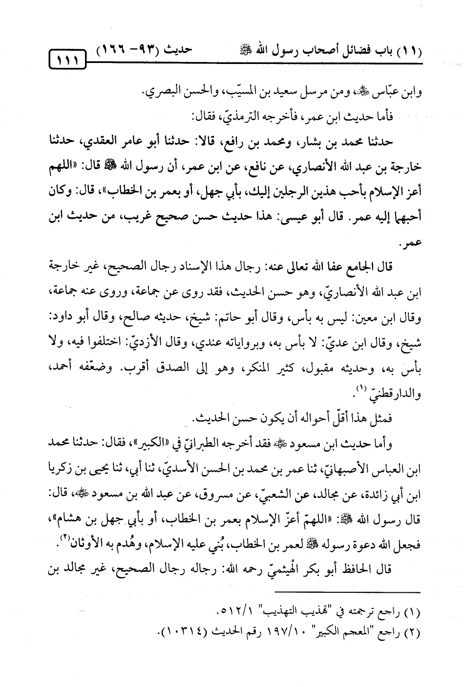 حدثنا محمد بن بشار، ومحمد بن رافع، قالا: حدثنا أَبو عامر العقدي، حدثنا خارجة بن عبد الله الأنصاري، عن نافع، عن ابن عمر، أن رسول الله -صلى الله عليه وسلم- قال: "اللهم أعز الإسلام بأحب هذين الرجلين إليك، بأبي جهل، أو بعمر بن الخطاب"، قال: وكان أحبهما إليه عمر. قال أَبو عيسى: هذا حديث حسن صحيح غريب، من حديث ابن عمر.