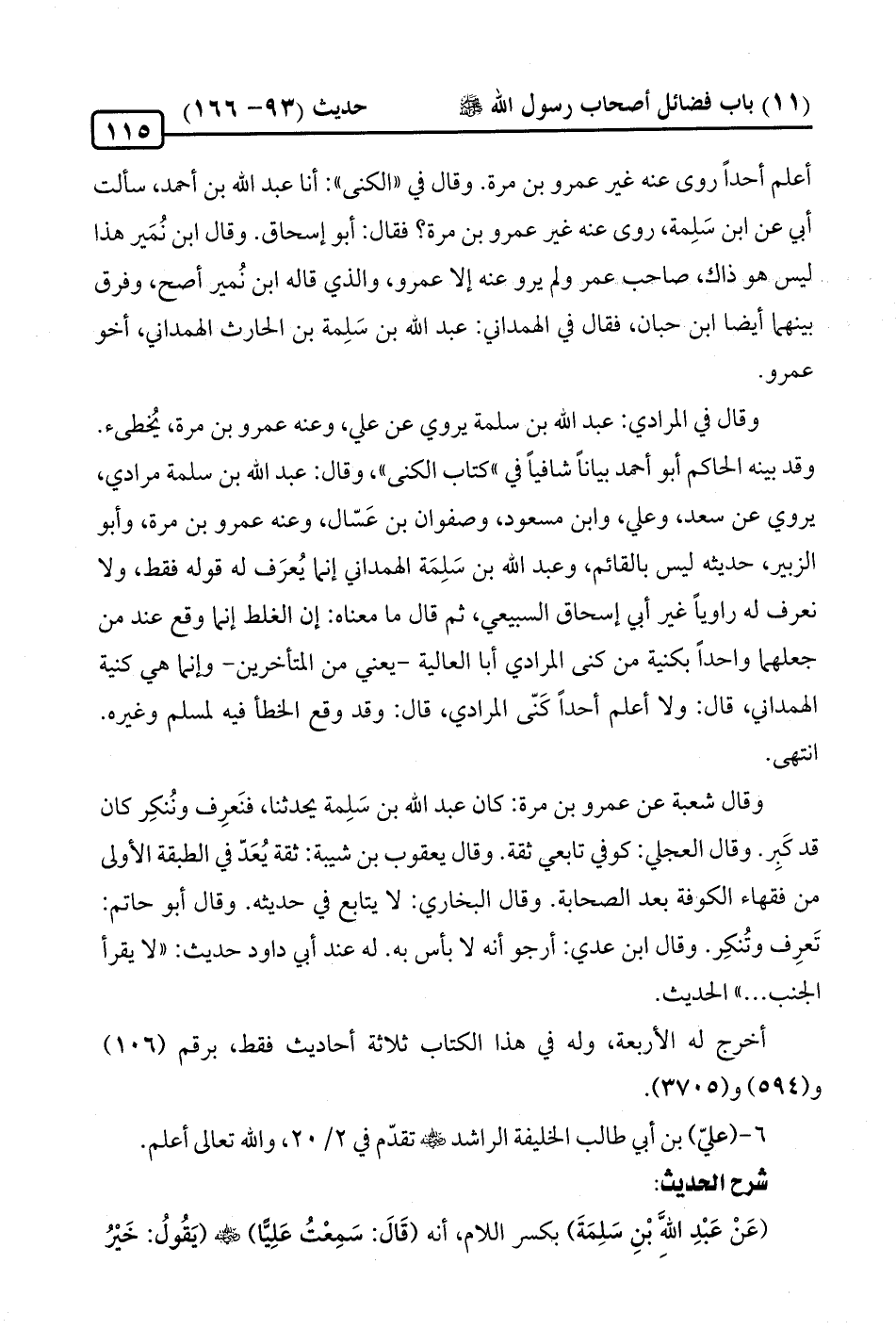وقد بينه الحاكم أَبو أحمد بيانًا شافيًا في "كتاب الكنى"، وقال: عبد الله بن سلمة مرادي، يروي عن سعد، وعلي، وابن مسعود، وصفوان بن عَسّال، وعنه عمرو بن مرة، وأبو الزبير، حديثه ليس بالقائم، وعبد الله بن سَلِمَة الهمداني إنما يُعرَف له قوله فقط، ولا نعرف له راويًا غير أبي إسحاق السبيعي، ثم قال ما معناه: إن الغلط إنما وقع عند من جعلهما واحدًا بكنية من كنى المرادي أبا العالية -يعني من المتأخرين- وإنما هي كنية الهمداني، قال: ولا أعلم أحدًا كَنّى المرادي، قال: وقد وقع الخطأ فيه لمسلم وغيره. انتهى.