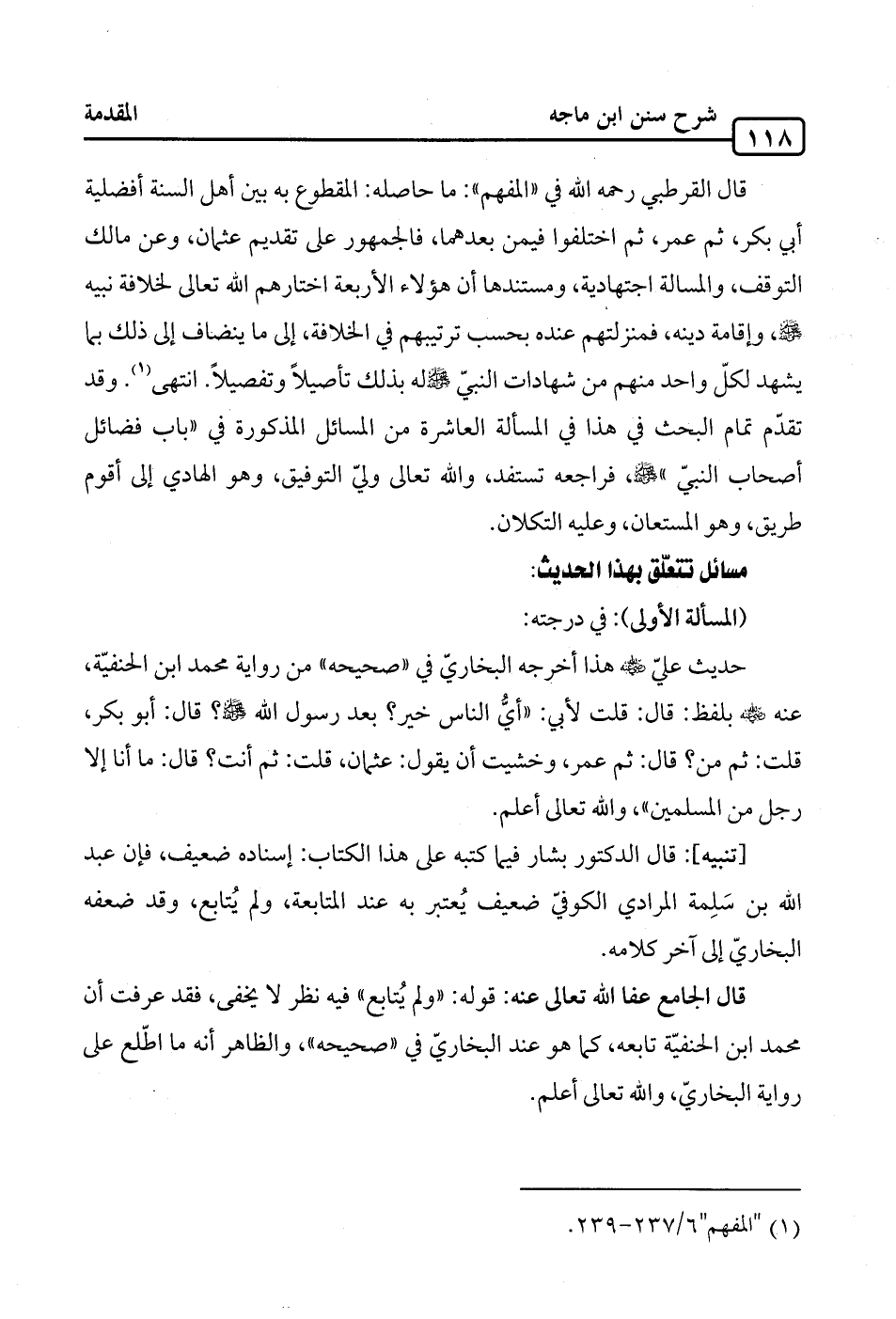 [تنبيه]: قال الدكتور بشار فيما كتبه على هذا الكتاب: إسناده ضعيف، فإن عبد الله بن سَلِمة المرادي الكوفيّ ضعيف يُعتبر به عند المتابعة، ولم يُتابع، وقد ضعفه البخاريّ إلى آخر كلامه.