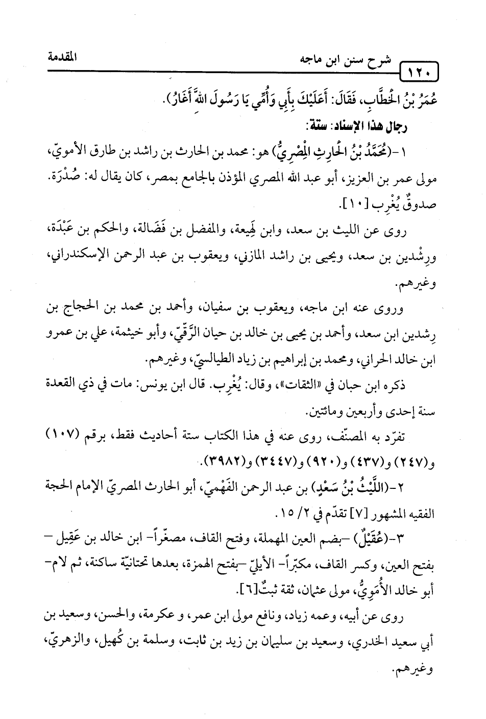 1 - (مُحَمَّدُ بْنُ الْحَارِثِ الْمِصْرِيُّ) هو: محمد بن الحارث بن راشد بن طارق الأمويّ، مولى عمر بن العزيز، أَبو عبد الله المصري المؤذن بالجامع بمصر، كان يقال له: صُدْرَة. صدوقٌ يُغْرِب [10].