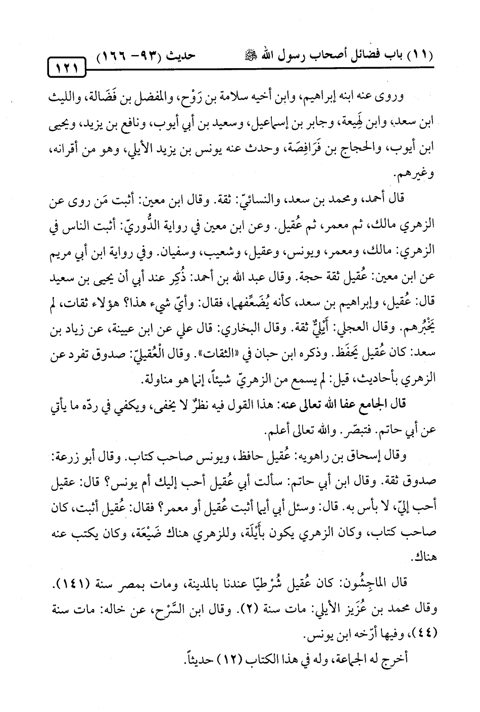 قال أحمد، ومحمد بن سعد، والنسائيّ: ثقة. وقال ابن معين: أثبت مَن روى عن الزهري مالك، ثم معمر، ثم عُقيل. وعن ابن معين في رواية الدُّوريّ: أثبت الناس في الزهري: مالك، ومعمر، ويونس، وعقيل، وشعيب، وسفيان. وفي رواية ابن أبي مريم عن ابن معين: عُقيل ثقة حجة. وقال عبد الله بن أحمد: ذُكِر عند أبي أن يحيى بن سعيد قال: عُقيل، وإبراهيم بن سعد، كأنه يُضَعِّفهما، فقال: وأيّ شيء هذا؟ هؤلاء ثقات، لم يَخْبُرهم. وقال العجلي: أَيْليٌّ ثقة. وقال البخاري: قال علي عن ابن عيينة، عن زياد بن سعد: كان عُقيل يَحفَظ. وذكره ابن حبان في "الثقات". وقال الْعُقيليّ: صدوق تفرد عن الزهري بأحاديث، قيل: لم يسمع من الزهريّ شيئًا، إنما هو مناولة.
