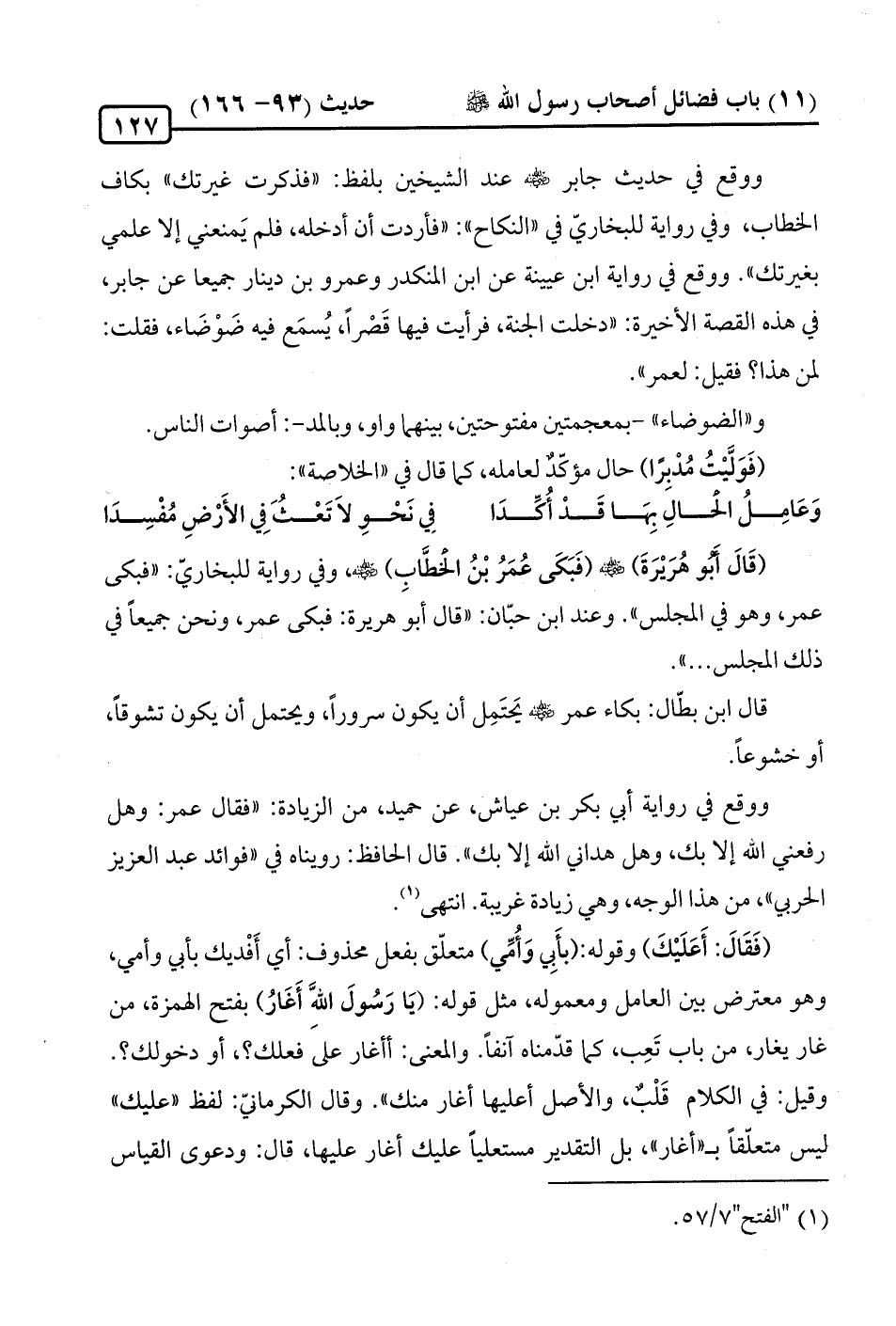 ووقع في حديث جابر -رضي الله عنه- عند الشيخين بلفظ: "فذكرت غيرتك" بكاف الخطاب، وفي رواية للبخاريّ في "النكاح": "فأردت أن أدخله، فلم يَمنعني إلا علمي بغيرتك". ووقع في رواية ابن عيينة عن ابن المنكدر وعمرو بن دينار جميعا عن جابر، في هذه القصة الأخيرة: "دخلت الجنة، فرأيت فيها قَصْرًا، يُسمَع فيه ضَوْضَاء، فقلت: لمن هذا؟ فقيل: لعمر".