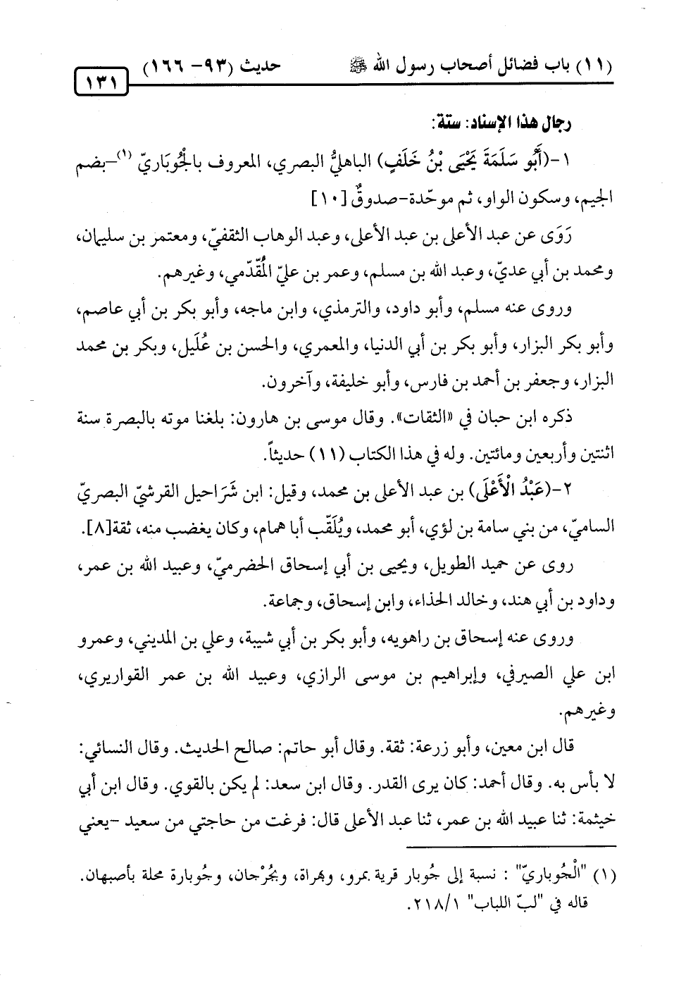 1 - (أَبُو سَلمَة يَحْيَى بْنُ خَلفٍ) الباهليُّ البصري، المعروف بالْجُوبَاريّ (¬1) -بضم الجيم، وسكون الواو، ثم موحّدة- صدوقٌ [10].