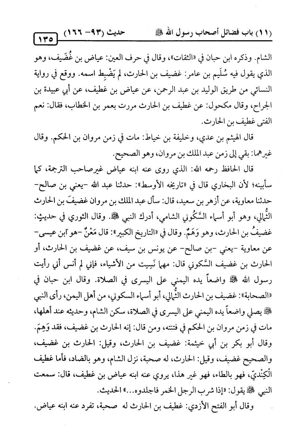 قال الحافظ رحمه الله: الذي روى عنه ابنه عياض غير صاحب الترجمة، كما سأبينه؛ لأن البخاري قال في "تاريخه الأوسط": حدثنا عبد الله -يعني بن صالح- حدثنا معاوية، عن أزهر بن سعيد، قال: سأل عبد الملك بن مروان غضيفَ بن الحارث الثُّمالي، وهو أَبو أسماء السَّكُوني الشامي، أدرك النبي صلى الله عليه وسلم. وقال الثوري في حديثٍ: غضيفُ بن الحارث، وهو وَهَمٌ. وقال في "التاريخ الكبير": قال مَعْنٌ -هو ابن عيسى- عن معاوية -يعني بن صالح- عن يونس بن سيف، عن غضيف بن الحارث، أو الحارث بن غضيف السَّكوني قال: مهما نَسِيت من الأشياء، فإني لم أنس أني رأيت رسول الله -صلى الله عليه وسلم- واضعًا يده اليمني على اليسرى في الصلاة. وقال ابن حبان في "الصحابة": غضيف بن الحارث الثُّمالي، أَبو أسماء السكوني، من أهل اليمن، رأى النبي صلى الله عليه وسلم يصلي واضعًا يده اليمني على اليسرى في الصلاة، سكن الشام، وحديثه عند أهلها، مات في زمن مروان بن الحكم في فتنته، ومن قال: إنه الحارث بن غضيف، فقد وَهِمَ. وقال أَبو بكر بن أبي خيثمة: غضيف بن الحارث، وقيل: الحارث بن غضيف، والصحيح غضيف، وقيل: الحارث، له صحبة، نزل الشام، وهو بالضاد، فأما غطيف الْكِنْديّ، فهو بالطاء، فهو غير هذا، يروي عنه ابنه عياض بن غطيف، قال: سمعت النبي صلى الله عليه وسلم يقول: "إذا شرب الرجل الخمر فاجلدوه ... " الحديث.