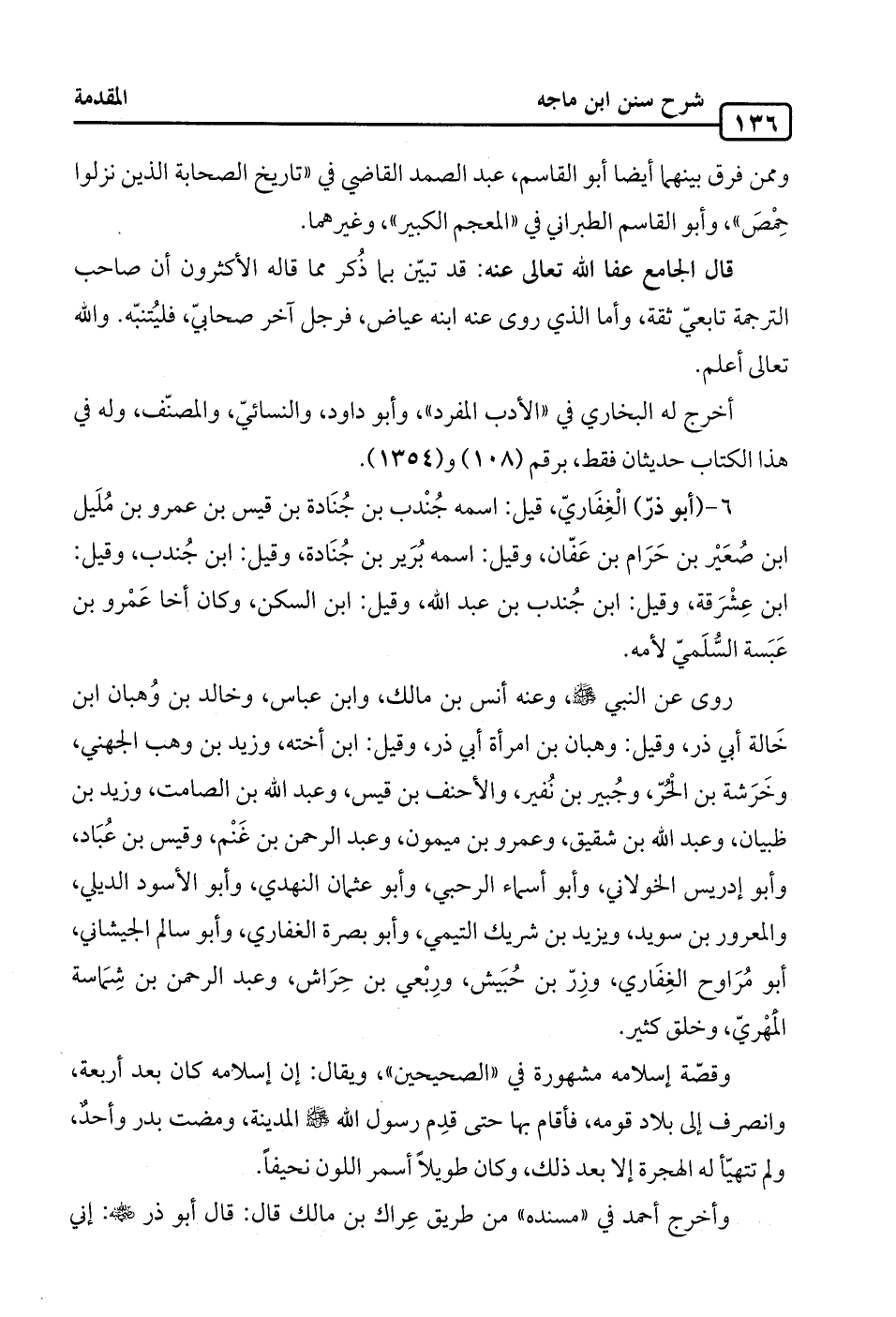 6 - (أَبو ذرّ) الْغِفَاريّ، قيل: اسمه جُنْدب بن جُنَادة بن قيس بن عمرو بن مُلَيل ابن صُعَيْر بن حَرَام بن عَفّان، وقيل: اسمه بُرَير بن جُنَادة، وقيل: ابن جُندب، وقيل: ابن عِشْرَقة، وقيل: ابن جُندب بن عبد الله، وقيل: ابن السكن، وكان أخا عَمْرو بن عَبَسة السُّلَميّ لأمه.