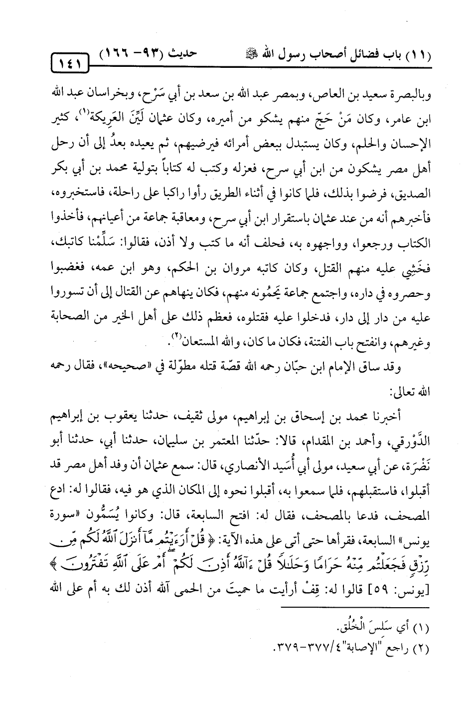 وقد ساق الإمام ابن حبّان رحمه الله قصّة قتله مطوّلة في "صحيحه"، فقال رحمه الله تعالى: أخبرنا محمد بن إسحاق بن إبراهيم، مولى ثقيف، حدثنا يعقوب بن إبراهيم الدَّوْرقي، وأحمد بن المقدام، قالا: حدّثنا المعتمر بن سليمان، حدثنا أبي، حدثنا أَبو نَضْرَة، عن أبي سعيد، مولى أبي أُسَيد الأنصاري، قال: سمع عثمان أن وفد أهل مصر قد أقبلوا، فاستقبلهم، فلما سمعوا به، أقبلوا نحوه إلى المكان الذي هو فيه، فقالوا له: ادع المصحف، فدعا بالمصحف، فقال له: افتح السابعة، قال: وكانوا يُسَمُّون "سورة يونس" السابعة، فقرأها حتى أتى على هذه الآية: {قُلْ أَرَأَيْتُمْ مَا أَنْزَلَ اللَّهُ لَكُمْ مِنْ رِزْقٍ فَجَعَلْتُمْ مِنْهُ حَرَامًا وَحَلَالًا قُلْ آللَّهُ أَذِنَ لَكُمْ أَمْ عَلَى اللَّهِ تَفْتَرُونَ} [يونس: 59] قالوا له: قِفْ أرأيت ما حميتَ من الحمى آلله أذن لك به أم على الله