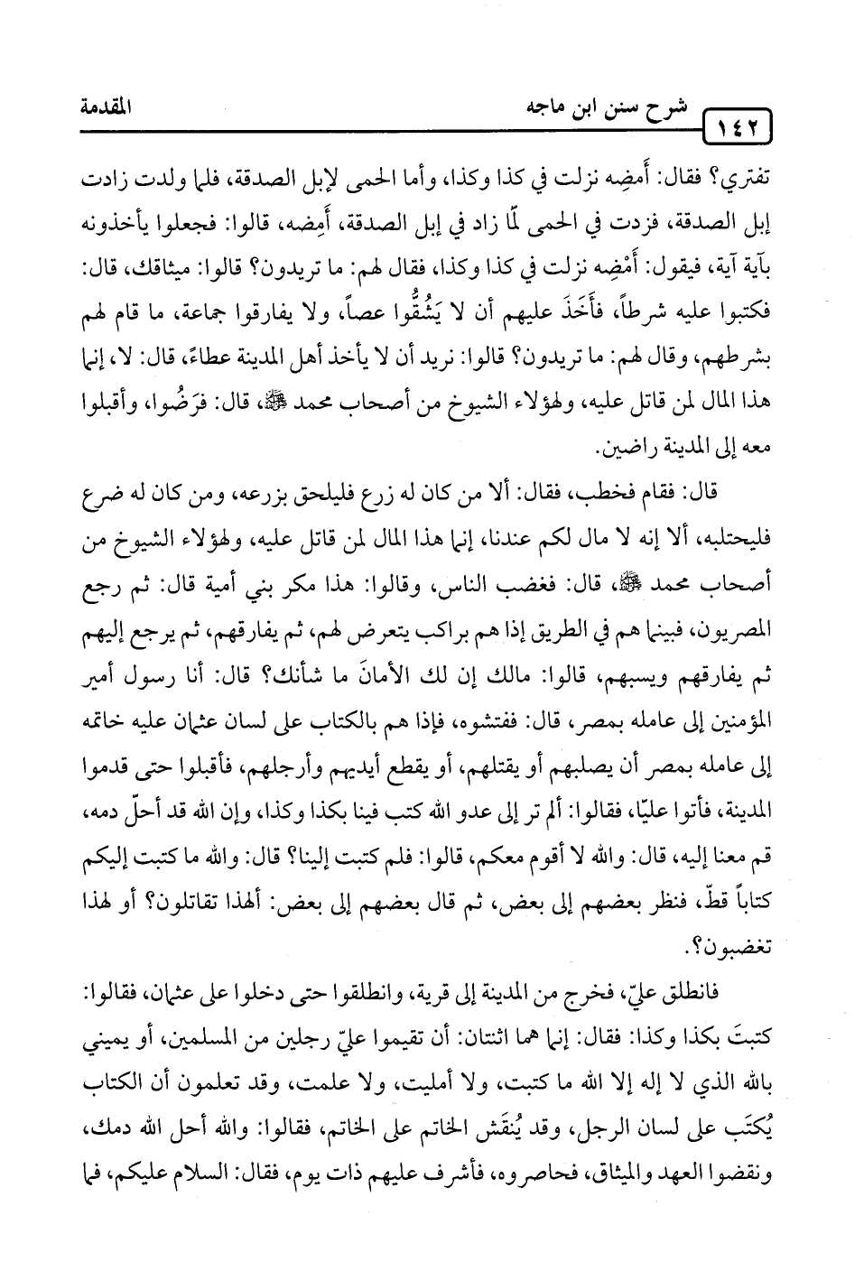 فانطلق عليّ، فخرج من المدينة إلى قرية، وانطلقوا حتى دخلوا على عثمان، فقالوا: كتبتَ بكذا وكذا: فقال: إنما هما اثنتان: أن تقيموا عليّ رجلين من المسلمين، أو يميني بالله الذي لا إله إلا الله ما كتبت، ولا أمليت، ولا علمت، وقد تعلمون أن الكتاب يُكتَب على لسان الرجل، وقد يُنقَش الخاتم على الخاتم، فقالوا: والله أحل الله دمك، ونقضوا العهد والميثاق، فحاصروه، فأشرف عليهم ذات يوم، فقال: السلام عليكم، فما