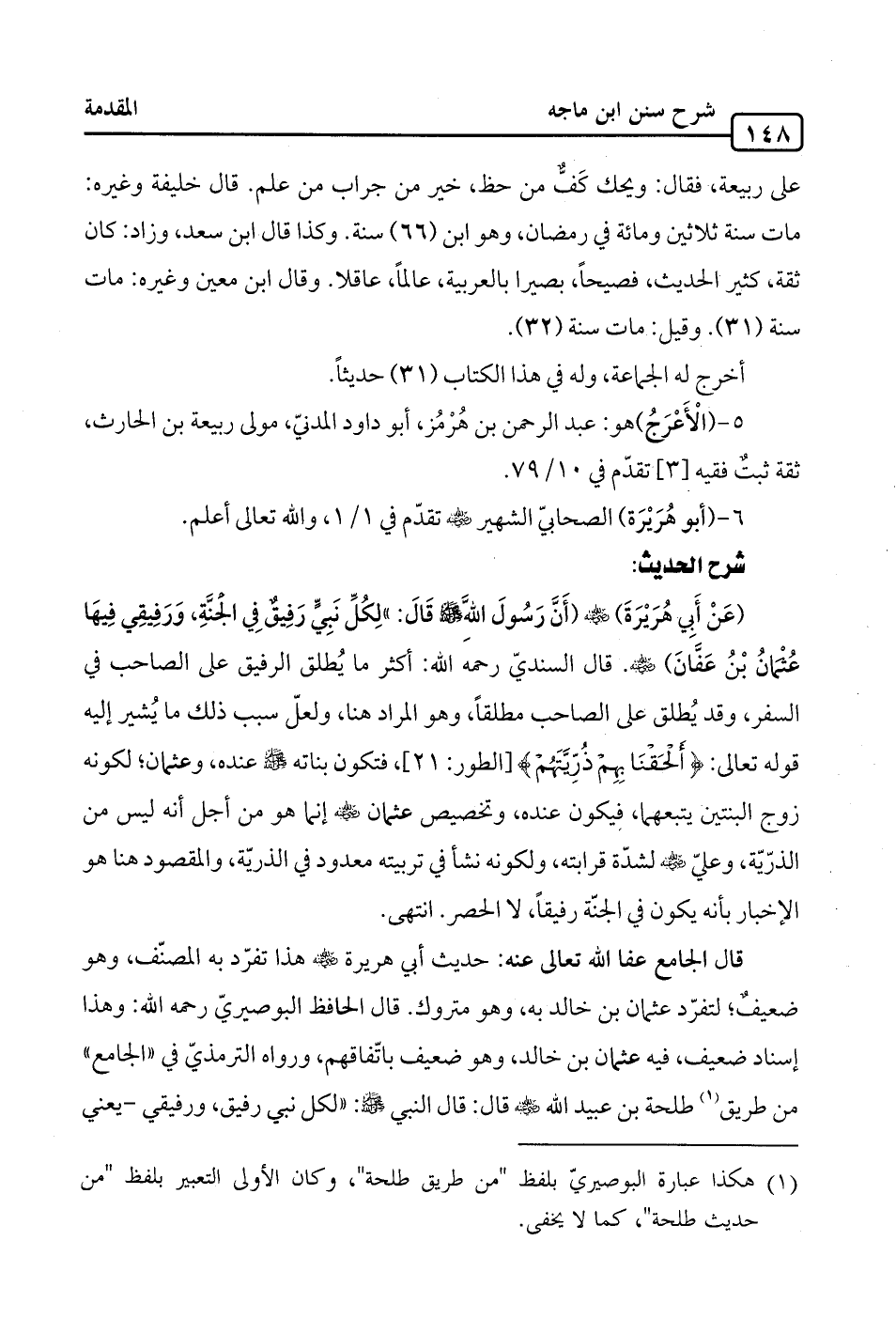 قال الجامع عفا الله تعالى عنه: حديث أبي هريرة -رضي الله عنه- هذا تفرّد به المصنّف، وهو ضعيفٌ؛ لتفرّد عثمان بن خالد به، وهو متروك. قال الحافظ البوصيريّ رحمه الله: وهذا إسناد ضعيف، فيه عثمان بن خالد، وهو ضعيف باتّفاقهم، ورواه الترمذيّ في "الجامع" من طريق (¬1) طلحة بن عبيد الله -رضي الله عنه- قال: قال النبي صلى الله عليه وسلم: "لكل نبي رفيق، ورفيقي -يعني