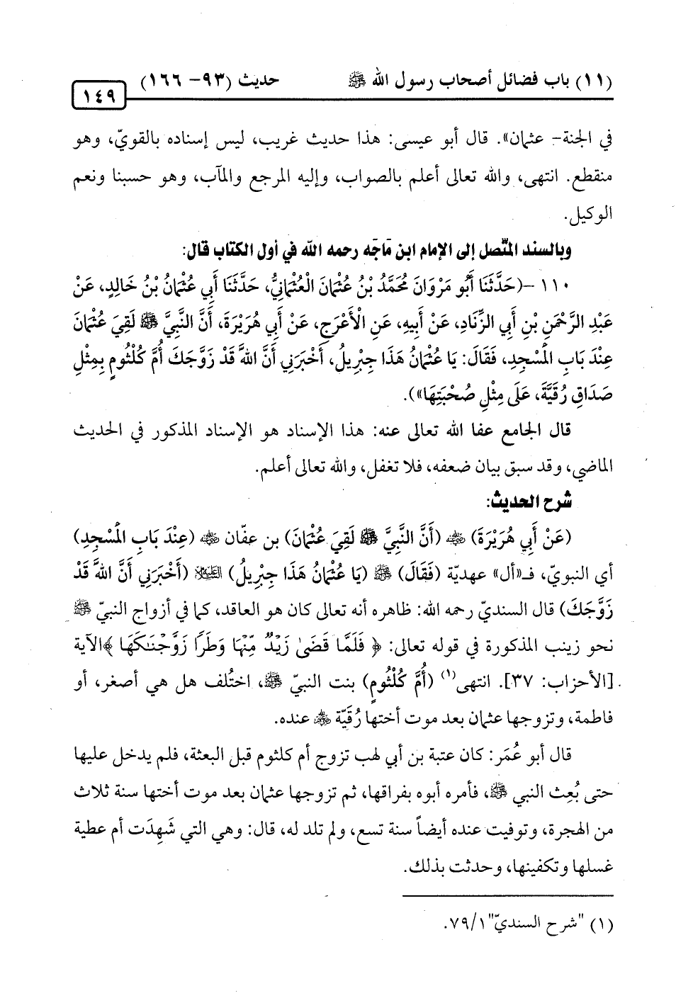 (عَنْ أَبِي هُرَيْرَةَ) -رضي الله عنه- (أَنَّ النَّبِيَّ -صلى الله عليه وسلم- لَقِيَ عُثْمَانَ) بن عفّان -رضي الله عنه- (عِنْدَ بَابِ الْمَسْجِدِ) أي النبويّ، فـ "أل" عهديّة (فَقالَ) -صلى الله عليه وسلم- (يَا عُثْمَانُ هَذَا جِبْرِيلُ) عليه السَّلام (أَخْبَرَنِي أَنَّ الله قَدْ زَوَّجَكَ) قال السنديّ رحمه الله: ظاهره أنه تعالى كان هو العاقد، كما في أزواج النبيّ -صلى الله عليه وسلم- نحو زينب المذكورة في قوله تعالى: {فَلَمَّا قَضَى زَيْدٌ مِنْهَا وَطَرًا زَوَّجْنَاكَهَا} [الأحزاب: 37]. انتهى (¬1) (أُمَّ كُلْثُومٍ) بنت النبيّ صلى الله عليه وسلم، اختُلف هل هي أصغر، أو فاطمة، وتزوجها عثمان بعد موت أختها رُقَيّة -رضي الله عنهم- عنده.