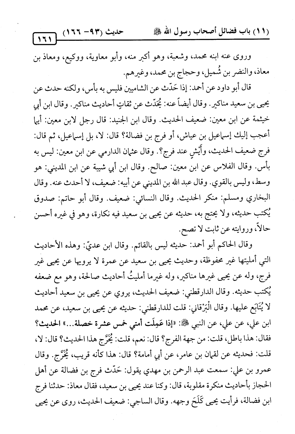 وقال الحاكم أَبو أحمد: حديثه ليس بالقائم. وقال ابن عديّ: وهذه الأحاديث التي أمليتها غير محفوظة، وحديث يحيى بن سعيد عن عمرة لا يرويها عن يحيى غير فرج، وله عن يحيى غيرها مناكير، وله غيرما أمليتُ أحاديث صالحة، وهو مع ضعفه يُكتب حديثه. وقال الدارقطني: ضعيف الحديث، يروي عن يحيى بن سعيد أحاديث لا يُتَابَع عليها. وقال الْبَرْقاني: قلت للدارقطني: حديثه عن يحيى بن سعيد، عن محمد ابن علي، عن علي، عن النبي صلى الله عليه وسلم: "إذا عَمِلَت أمتي خمس عشرة خصلة ... " الحديث؟ فقال: هذا باطل، قلت: من جهة الفرج؟ قال: نعم، قلت: يُخَرَّج هذا الحديث؟ قال: لا، قلت: فحديثه عن لقمان بن عامر، عن أبي أمامة؟ قال: هذا كأنه قريب، يُخَرَّج. وقال عمرو بن علي: سمعت عبد الرحمن بن مهدي يقول: حَدّث فرج بن فضالة عن أهل الحجاز بأحاديث منكرة مقلوبة، قال: وكنا عند يحيى بن سعيد، فقال معاذ: حدثنا فرج ابن فضالة، فرأيت يحيى كَلَحَ وجهه. وقال الساجي: ضعيف الحديث، روى عن يحيى