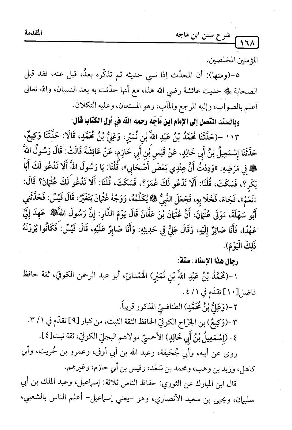 113 - (حَدَّثَنَا مُحَمَّدُ بْنُ عَبْدِ اللهِ بْنِ نُمَيْرٍ، وَعِليُّ بْنُ مُحَمَّدٍ، قَالَا: حَدَّثَنَا وَكِيعٌ، حَدَّثَنَا إِسْمَاعِيلُ بْنُ أَبِي خَالِدٍ، عَنْ قَيْسِ بنِ أَبِي حَازِم، عَنْ عَائِشَةَ قَالَتْ: قَالَ رَسُولُ الله -صلى الله عليه وسلم- في مَرَضِهِ:" وَدِدْتُ أَنَّ عِنْدِي بَعْضَ أَصْحَابِي"، قُلْنَا: يَا رَسُولَ الله أَلا نَدْعُو لَكَ أَبَا بَكْرٍ؟، فَسَكَتَ، قُلْنَا: أَلا نَدْعُو لَكَ عُمَرَ؟، فَسَكَتَ، قُلْنَا: أَلا نَدْعُو لَكَ عُثْمَانَ؟ قَالَ: "نَعَمْ"، فَجَاءَ، فَخَلَا بِهِ، فَجَعَلَ النَّبِيُّ -صلى الله عليه وسلم- يُكَلِّمُهُ، وَوَجْهُ عُثْمَانَ يَتَغَيَّرُ، قَالَ قَيْسٌ: فَحَدَّثَنِى أَبُو سَهْلَةَ، مَوْلَى عُثْمَانَ، أَنَّ عُثْمَانَ بْنَ عَفَّانَ قَالَ يَوْمَ الدَّار: إِنَّ رَسُولَ الله -صلى الله عليه وسلم- عَهدَ إِلَيَّ عَهْدًا، فَأَنَا صَائِرٌ إِلَيْهِ، وَقَالَ عَلِيٌّ في حَدِيثِهِ: وَأَنَا صَابِرٌ عَلَيْهِ، قَالَ قَيْسٌ: فَكَانُوا يُرَوْنَهُ ذَلِكَ الْيَوْمَ).