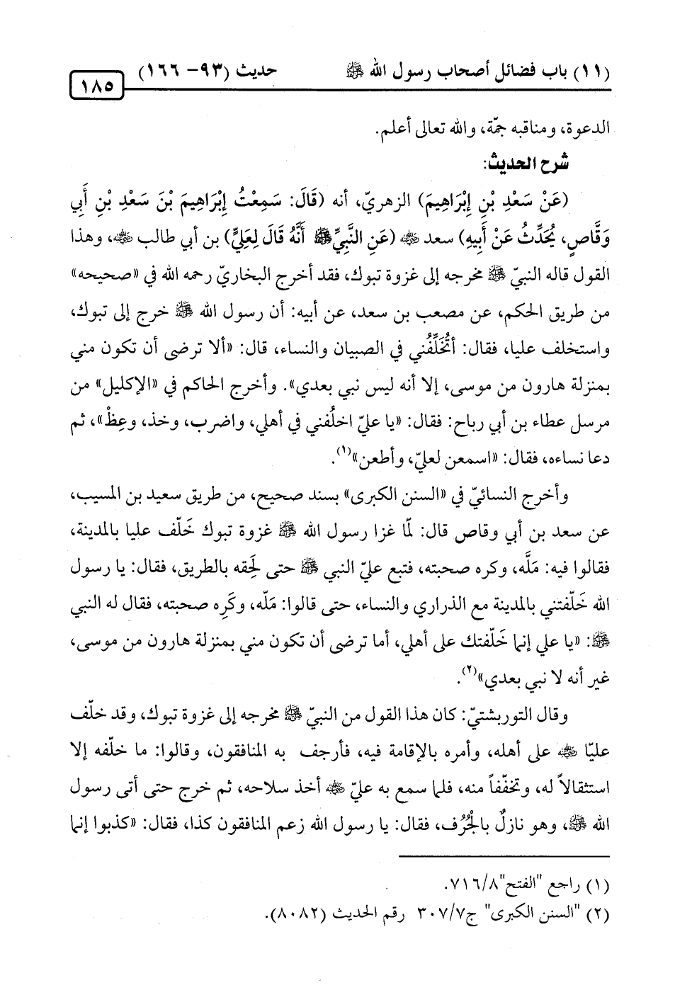 وأخرج النسائيّ في "السنن الكبرى" بسند صحيح، من طريق سعيد بن المسيب، عن سعد بن أبي وقاص قال: لمّا غزا رسول الله -صلى الله عليه وسلم- غزوة تبوك خَلّف عليا بالمدينة، فقالوا فيه: مَلَّه، وكره صحبته، فتبع عليّ النبي صلى الله عليه وسلم حتى لَحِقه بالطريق، فقال: يا رسول الله خَلّفتني بالمدينة مع الذراري والنساء، حتى قالوا: مَلّه، وكَرِه صحبته، فقال له النبي صلى الله عليه وسلم: "يا علي إنما خَلّفتك على أهلي، أما ترضى أن تكون مني بمنزلة هارون من موسى، غير أنه لا نبي بعدي" (¬2).