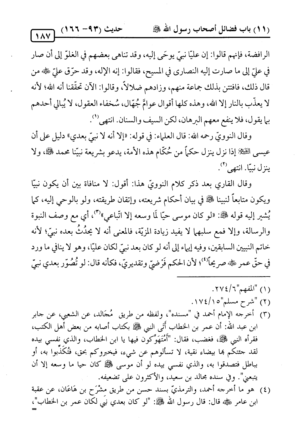 وقال القاري بعد ذكر كلام النوويّ هذا: أقول: لا منافاة بين أن يكون نبيّا ويكون متابعًا لنبينا -صلى الله عليه وسلم- في بيان أحكام شريعته، وإتقان طريقته، ولو بالوحي إليه، كما يُشير إليه قوله -صلى الله عليه وسلم-: "لو كان موسى حيّا لمَا وسعه إلا اتّباعي" (¬3)، أي مع وصف النبوة والرسالة، وإلا فمع سلبهما لا يفيد زيادة المزيّة، فالمعنى أنه لا يحدُثُ بعده نبيّ؛ لأنه خاتم النبيين السابقين، وفيه إيماء إلى أنه لو كان بعد نبيّ لكان عليّا، وهو لا ينافي ما ورد في حقّ عمر -رضي الله عنه- صريحًا (¬4)؛ لأن الحكم فَرْضيّ وتقديريّ، فكأنه قال: لو تُصُوّر بعدي نبيّ