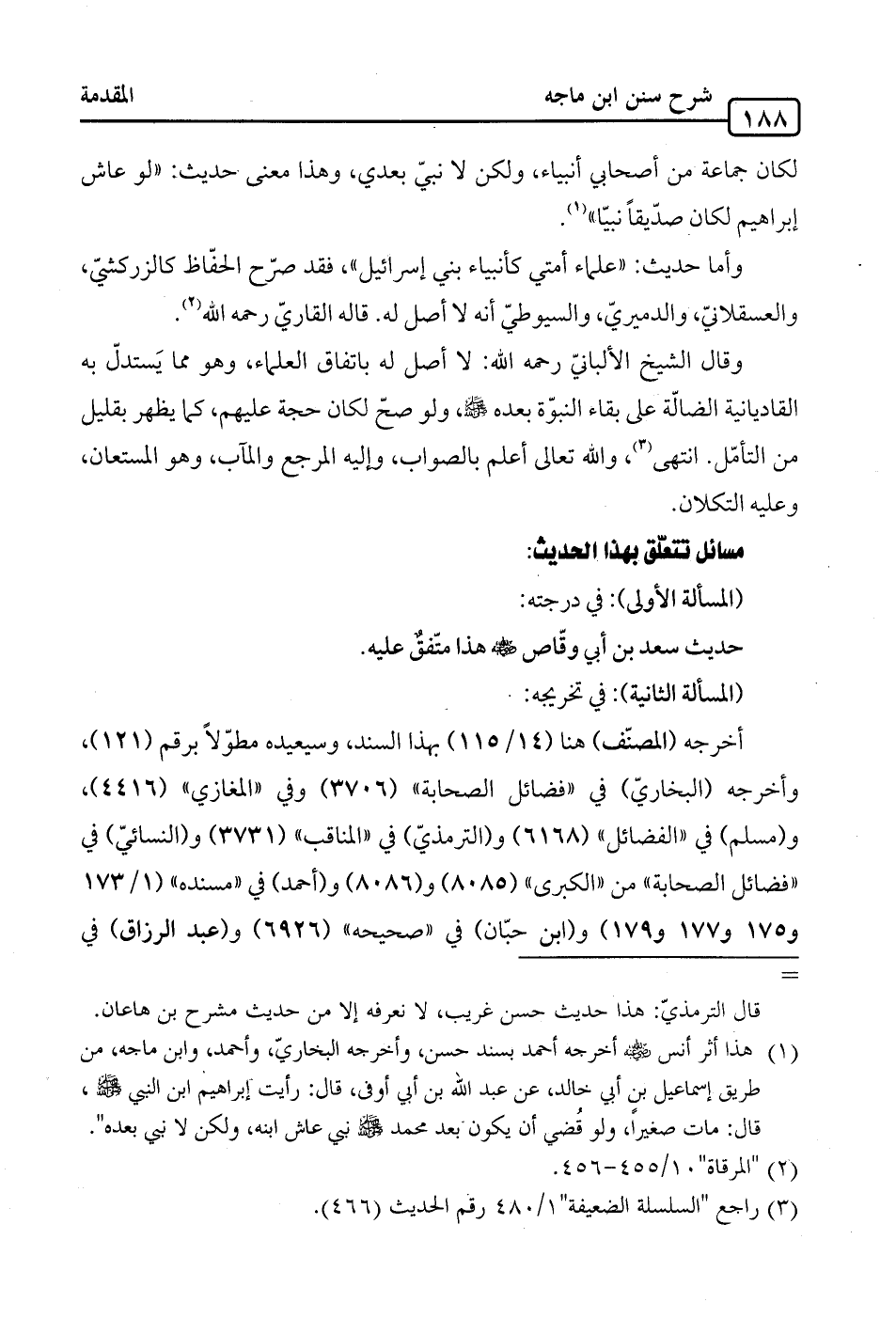 وقال الشيخ الألبانيّ رحمه الله: لا أصل له باتفاق العلماء، وهو مما يَستدلّ به القاديانية الضالّة على بقاء النبوّة بعده -صلى الله عليه وسلم-، ولو صحّ لكان حجة عليهم، كما يظهر بقليل من التأمّل. انتهى (¬3)، والله تعالى أعلم بالصواب، وإليه المرجع والمآب، وهو المستعان، وعليه التكلان.