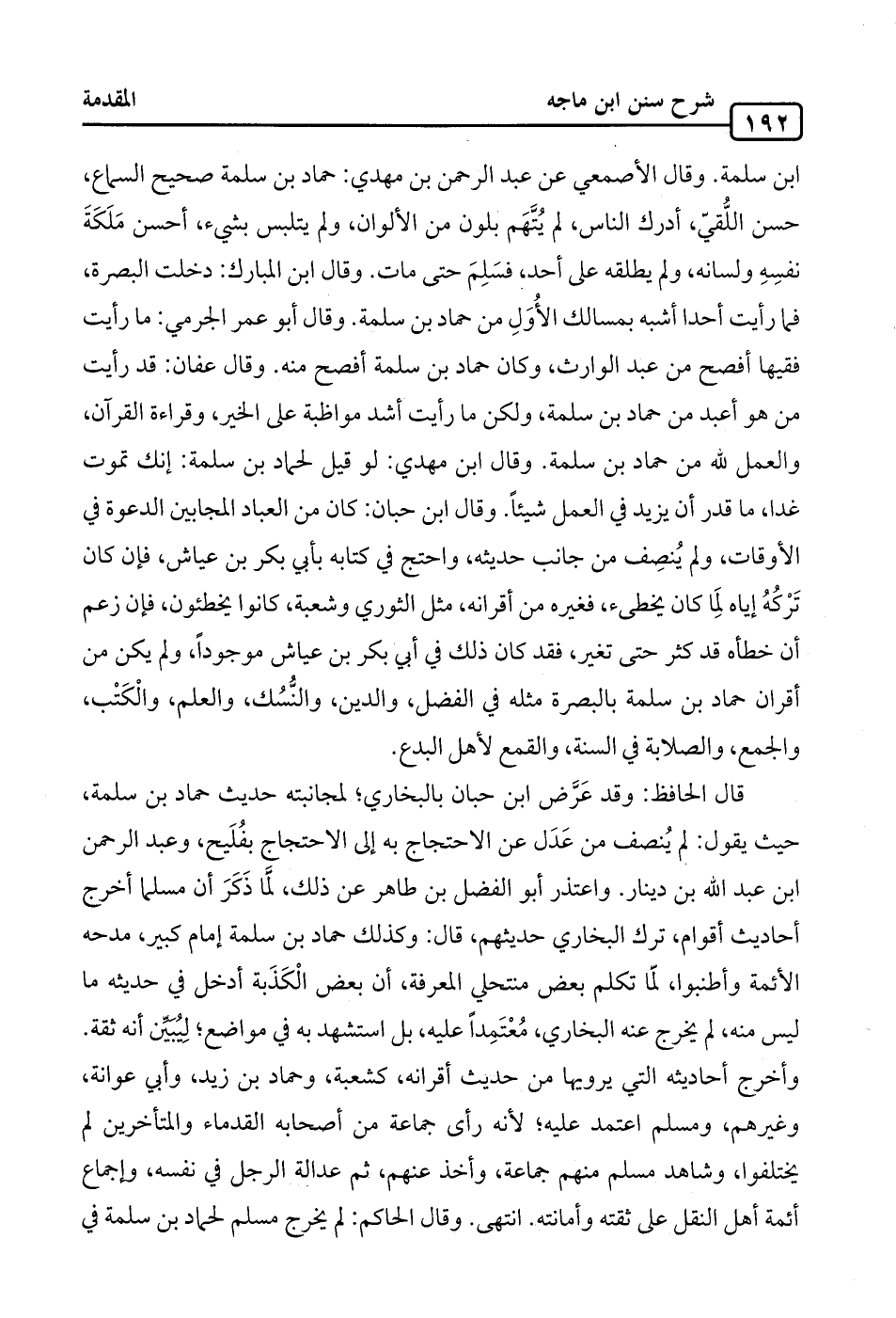 ابن سلمة. وقال الأصمعي عن عبد الرحمن بن مهدي: حماد بن سلمة صحيح السماع، حسن اللُّقيّ، أدرك الناس، لم يُتَّهَم بلون من الألوان، ولم يتلبس بشيء، أحسن مَلَكَةَ نفسِهِ ولسانه، ولم يطلقه على أحد، فسَلِمَ حتى مات. وقال ابن المبارك: دخلت البصرة، فما رأيت أحدا أشبه بمسالك الأُوَلِ من حماد بن سلمة. وقال أَبو عمر الجرمي: ما رأيت فقيها أفصح من عبد الوارث، وكان حماد بن سلمة أفصح منه. وقال عفان: قد رأيت من هو أعبد من حماد بن سلمة، ولكن ما رأيت أشد مواظبة على الخير، وقراءة القرآن، والعمل لله من حماد بن سلمة. وقال ابن مهدي: لو قيل لحماد بن سلمة: إنك تموت غدا، ما قدر أن يزيد في العمل شيئًا. وقال ابن حبان: كان من العباد المجابين الدعوة في الأوقات، ولم يُنصِف من جانب حديثه، واحتج في كتابه بأبي بكر بن عياش، فإن كان تَرْكُهُ إياه لِمَا كان يخطىء، فغيره من أقرانه، مثل الثوري وشعبة، كانوا يخطئون، فإن زعم أن خطأه قد كثر حتى تغير، فقد كان ذلك في أبي بكر بن عياش موجودًا، ولم يكن من أقران حماد بن سلمة بالبصرة مثله في الفضل، والدين، والنُّسُك، والعلم، والْكَتْب، والجمع، والصلابة في السنة، والقمع لأهل البدع.