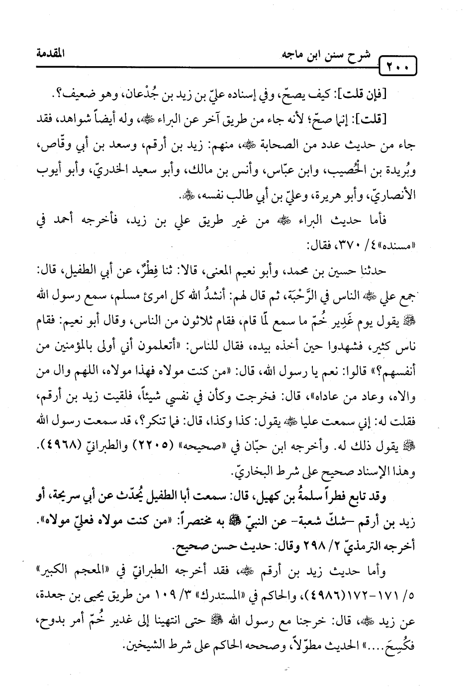 حدثنا حسين بن محمد، وأبو نعيم المعنى، قالا: ثنا فِطْرٌ، عن أبي الطفيل، قال: جمع علي -رضي الله عنه- الناس في الرَّحْبَة، ثم قال لهم: أنشدُ الله كل امرئ مسلم، سمع رسول الله صلى الله عليه وسلم يقول يوم غَدِير خُمّ ما سمع لمّا قام، فقام ثلاثون من الناس، وقال أَبو نعيم: فقام ناس كثير، فشهدوا حين أخذه بيده، فقال للناس: "أتعلمون أني أولى بالمؤمنين من أنفسهم؟ " قالوا: نعم يا رسول الله، قال: "من كنت مولاه فهذا مولاه، اللهم وال من والاه، وعاد من عاداه"، قال: فخرجت وكأن في نفسي شيئًا، فلقيت زيد بن أرقم، فقلت له: إني سمعت عليا -رضي الله عنه- يقول: كذا وكذا، قال: فما تنكر؟، قد سمعت رسول الله -صلى الله عليه وسلم- يقول ذلك له. وأخرجه ابن حبّان في "صحيحه" (2205) والطبرانيّ (4968).