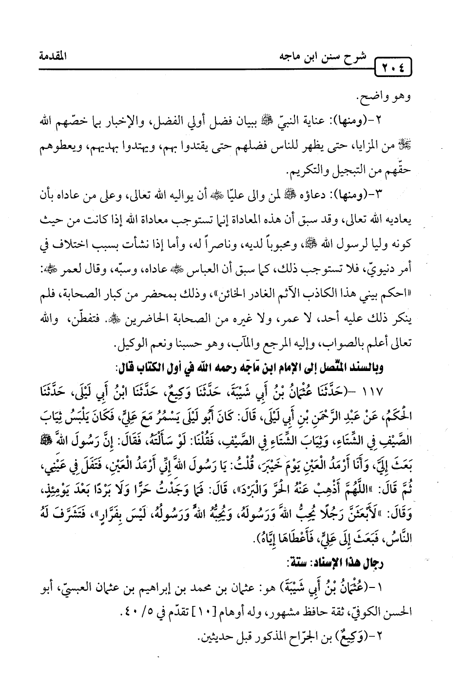 117 - (حَدَّثَنَا عُثْمَانُ بْنُ أَبِي شَيْبَةَ، حَدَّثَنَا وَكِيعٌ، حَدَّثَنَا ابْنُ أَبِي لَيْلَى، حَدَّثَنَا الحكَمُ، عَنْ عَبْدِ الرَّحْمَنِ بْنِ أَبِي لَيْلَى، قَالَ: كَانَ أَبُو لَيْلَى يَسْمُرُ مَعَ عَلِيٍّ، فَكَانَ يَلْبَسُ ثِيَابَ الصَّيْفِ في الشِّتَاءِ، وَثِيَابَ الشِّتَاءِ في الصَّيْفِ، فَقُلْنَا: لَوْ سَأَلْتُهُ، فَقَالَ: إِنَّ رَسُولَ الله -صلى الله عليه وسلم- بَعَثَ إِليّ، وَأَنَا أَرْمَدُ الْعَيْنِ يَوْمَ خَيْبَرَ، قُلْتُ: يَا رَسُولَ الله إِنِّي أَرْمَدُ الْعَيْنِ، فَتَفَلَ في عَيْنِي، ثُمَّ قَالَ: "اللَّهُمَّ أَذْهِبْ عَنْهُ الْحَرَّ وَالْبَرْدَ"، قَالَ: فَمَا وَجَدْتُ حَرًّا وَلَا بَرْدًا بَعْدَ يَوْمِئِذٍ، وَقَالَ: "لأبْعَثَنَّ رَجُلًا يُحِبُّ اللهَ وَرَسُولَهُ، وَيُحِبُّهُ اللهُ وَرَسُولُهُ، لَيْسَ بِفَرَّارٍ"، فَتَشَرَّفَ لَهُ النَّاسُ، فَبَعَثَ إِلَى عَليٍّ، فَأَعْطَاهَا إِيَّاهُ).