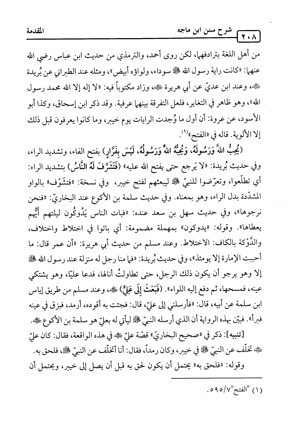 (يُحِبُّ الله وَرَسُولَهُ، وَيُحِبُّهُ الله وَرَسُولُهُ، لَيْسَ بِفَرَّارٍ) بفتح الفاء، وتشديد الراء، وفي حديث بُريدة: "لا يَرجع حتى يفتح الله عليه" (فَتَشَرَّفَ لَهُ النَّاسُ) بتشديد الراء: أي تطلّعوا، وتعرّضوا للنبيّ -صلى الله عليه وسلم- ليبعثهم لفتح خيبر، وفي نسخة: "فتشَوّف" بالواو المشدّدة بدل الراء، وهو بمعناه. وفي حديث سلمة بن الأكوع عند البخاريّ: "فنحن نرجوها"، وفي حديث سهل بن سعد عنده: "فبات الناس يَدُوكُون ليلتهم أَيُّهم يعطاها". وقوله: "يدوكون" بمهملة مضمومة: أي باتوا في اختلاط واختلاف، والدَّوْكة بالكاف: الاختلاط. وعند مسلم من حديث أبي هريرة: "أن عمر قال: ما أحببت الإمارة إلا يومئذ"، وفي حديث بُريدة: "فما منا رجل له منزلة عند رسول الله -صلى الله عليه وسلم- إلا وهو يرجو أن يكون ذلك الرجل، حتى تطاولتُ أنالها، فدعا عليّا، وهو يشتكي عينه، فمسحها، ثم دفع إليه اللواء". (فَبَعَثَ إِلَى عَليٍّ) -رضي الله عنه-، وعند مسلم من طريق إياس ابن سلمة عن أبيه، قال: "فأرسلني إلى عليّ، قال: فجئت به أقوده، أرمد، فبزق في عينه فبرأ". فبيّن بهذه الرواية أن الذي أرسله النبيّ -صلى الله عليه وسلم- ليأتي له بعليّ هو سلمة بن الأكوع -رضي الله عنه-.