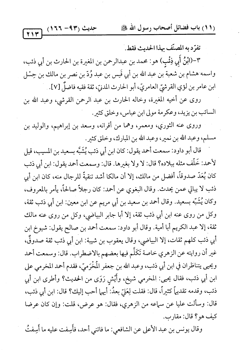 3 - (ابْنُ أَبِي ذِئْبٍ) هو: محمد بن عبد الرحمن بن المغيرة بن الحارث بن أبي ذئب، واسمه هشام بن شعبة بن عبد الله بن أبي قَيس بن عبد وُدّ بن نصر بن مالك بن حِسْل ابن عامر بن لؤي القرشيّ العامريّ، أَبو الحارث المدنيّ، ثقة فقيه فاضلٌ [7].