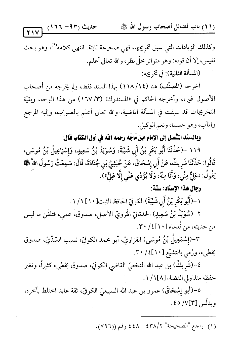 119 - (حَدَّثَنَا أَبُو بَكْرِ بْنُ أَبِي شَيْبَةَ، وَسُوَيْدُ بْنُ سَعِيدٍ، وَإِسْمَاعِيلُ بْنُ مُوسَى، قَالُوا: حَدَّثَنَا شَرِيكٌ، عَنْ أَبِي إِسْحَاقَ، عَنْ حُبْشِيِّ بْنِ جُنَادَةَ، قَالَ: سَمِعْتُ رَسُولَ الله -صلى الله عليه وسلم- يَقُولُ: "عَلِيٌّ مِنِّي، وَأَنَا مِنْهُ، وَلَا يُؤَدِّي عَنِّي إِلَّا عَلِيٌّ").