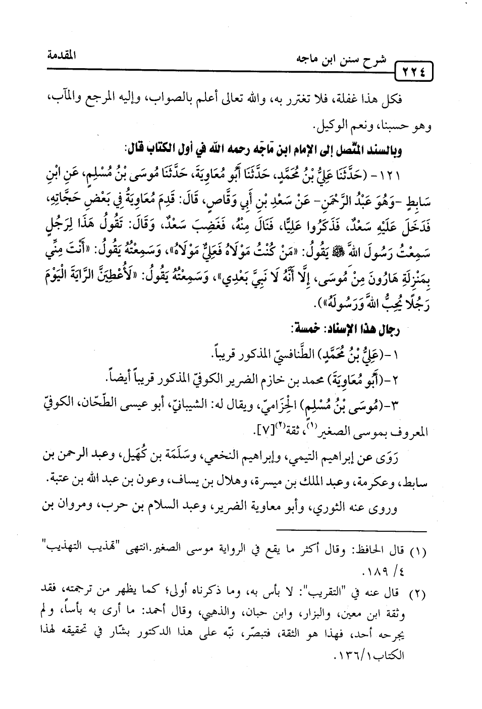 121 - (حَدَّثَنَا عَلِيُّ بْنُ مُحَمَّدٍ، حَدَّثَنَا أَبُو مُعَاوِيَةَ، حَدَّثَنَا مُوسَى بْنُ مُسْلِمٍ، عَنِ ابْنِ سَابِطٍ -وَهُوَ عَبْدُ الرَّحْمَنِ- عَنْ سَعْدِ بْنِ أَبِي وَقَّاصٍ، قَالَ: قَدِمَ مُعَاوِيَةُ في بَعْضِ حَجَّاتِهِ، فَدَخَلَ عَلَيْهِ سَعْدٌ، فَذَكَرُوا عَلِيًّا، فَنَالَ مِنْهُ، فَغَضِبَ سَعْدٌ، وَقَالَ: تَقُولُ هَذَا لِرَجُلٍ سَمِعْتُ رَسُولَ اللهِ -صلى الله عليه وسلم- يَقُولُ: "مَنْ كُنْتُ مَوْلَاهُ فَعِليٌّ مَوْلَاهُ"، وَسَمِعْته يَقُولُ: "أَنْتَ مِنِّي بِمَنْزِلَةِ هَارُونَ مِنْ مُوسَى، إِلَّا أَنَّهُ لَا نَبِيَّ بَعْدِي"، وَسَمِعْته يَقُولُ: "لَأُعْطِيَنَّ الرَّايَةَ الْيَوْمَ رَجُلًا يُحِبُّ الله وَرَسُولَهُ").