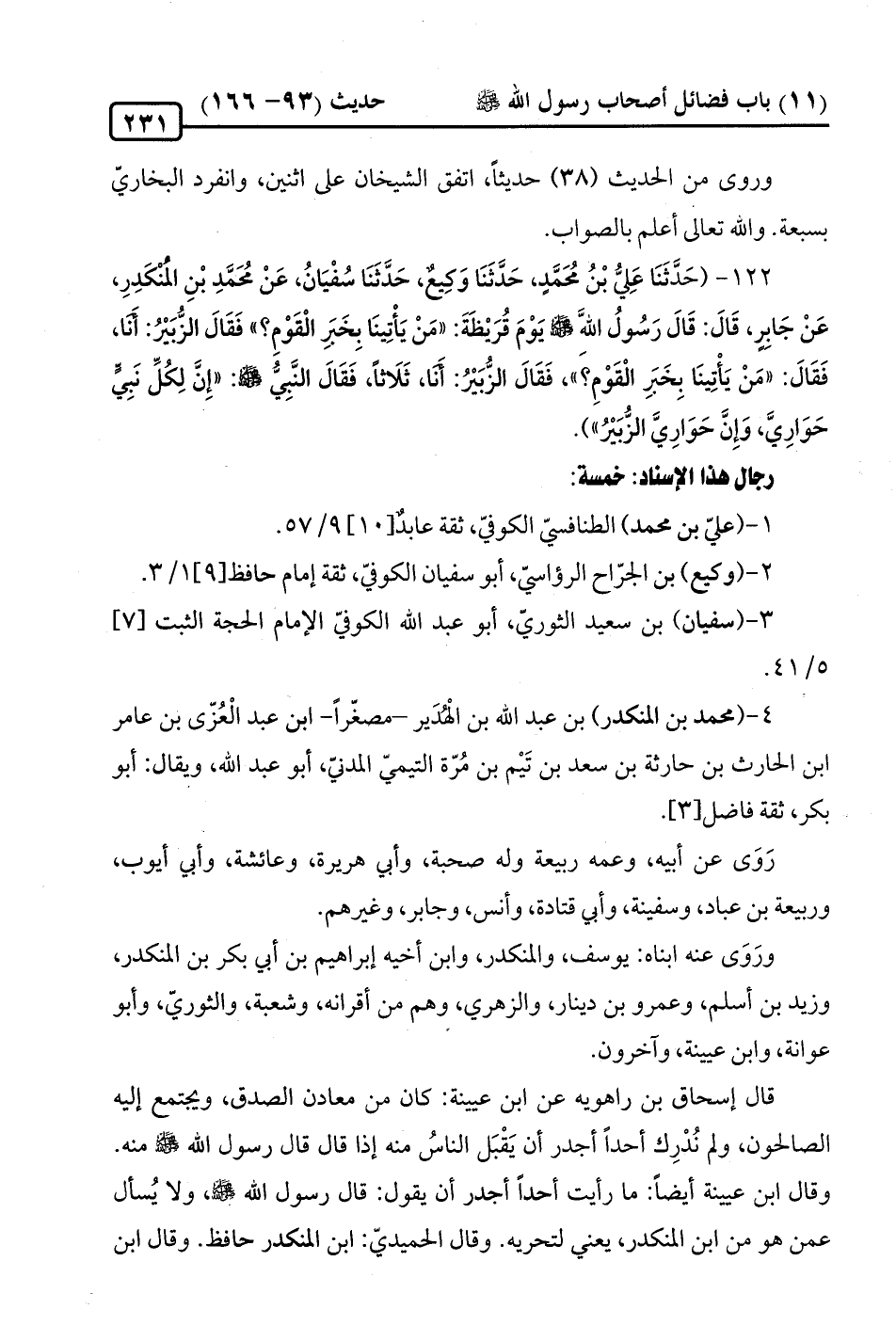 122 - (حَدَّثَنَا عَليُّ بْنُ مُحَمَّدٍ، حَدَّثَنَا وَكيع، حَدَّثَنَا سُفْيَانُ، عَنْ مُحَمَّدِ بْنِ المُنْكَدِرِ، عَنْ جَابر، قَالَ: قَالَ رَسُولُ الله -صلى الله عليه وسلم- يَوْمَ قُرَيْظَةَ: "مَنْ يَأْتِينَا بِخَبَرِ الْقَوْمِ؟ " فَقَالَ الزُّبَيْرُ: أَنَا، فَقَالَ: "مَنْ يَأْتِينَا بِخَبَرِ الْقَوْمِ؟ "، فَقَالَ الزُّبَيْرُ: أَنَا، ثَلَاثًا، فَقَالَ النَّبِيُّ -صلى الله عليه وسلم-: "إِنَّ لِكُلِّ نَبِيًّ حَوَارِيَّ، وَإِنَّ حَوَارِيَّ الزُّبَيْرُ").