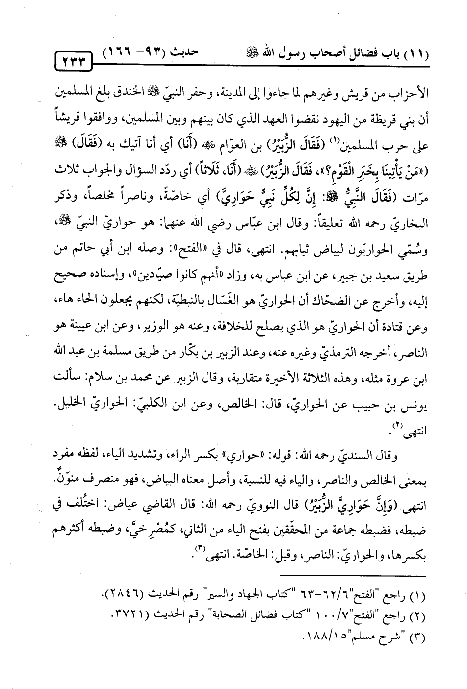 وقال السنديّ رحمه الله: قوله: "حواري" بكسر الراء، وتشديد الياء، لفظه مفرد بمعنى الخالص والناصر، والياء فيه للنسبة، وأصل معناه البياض، فهو منصرف منوّنٌ. انتهى (وَإِنَّ حَوَارِيَّ الزُّبَيْرُ) قال النووي رحمه الله: قال القاضي عياض: اختُلف في ضبطه، فضبطه جماعة من المحققين بفتح الياء من الثّاني، كمُصْرِخيَّ، وضبطه أكثرهم بكسرها، والحواريّ: الناصر، وقيل: الخاصّة. انتهى (¬3).