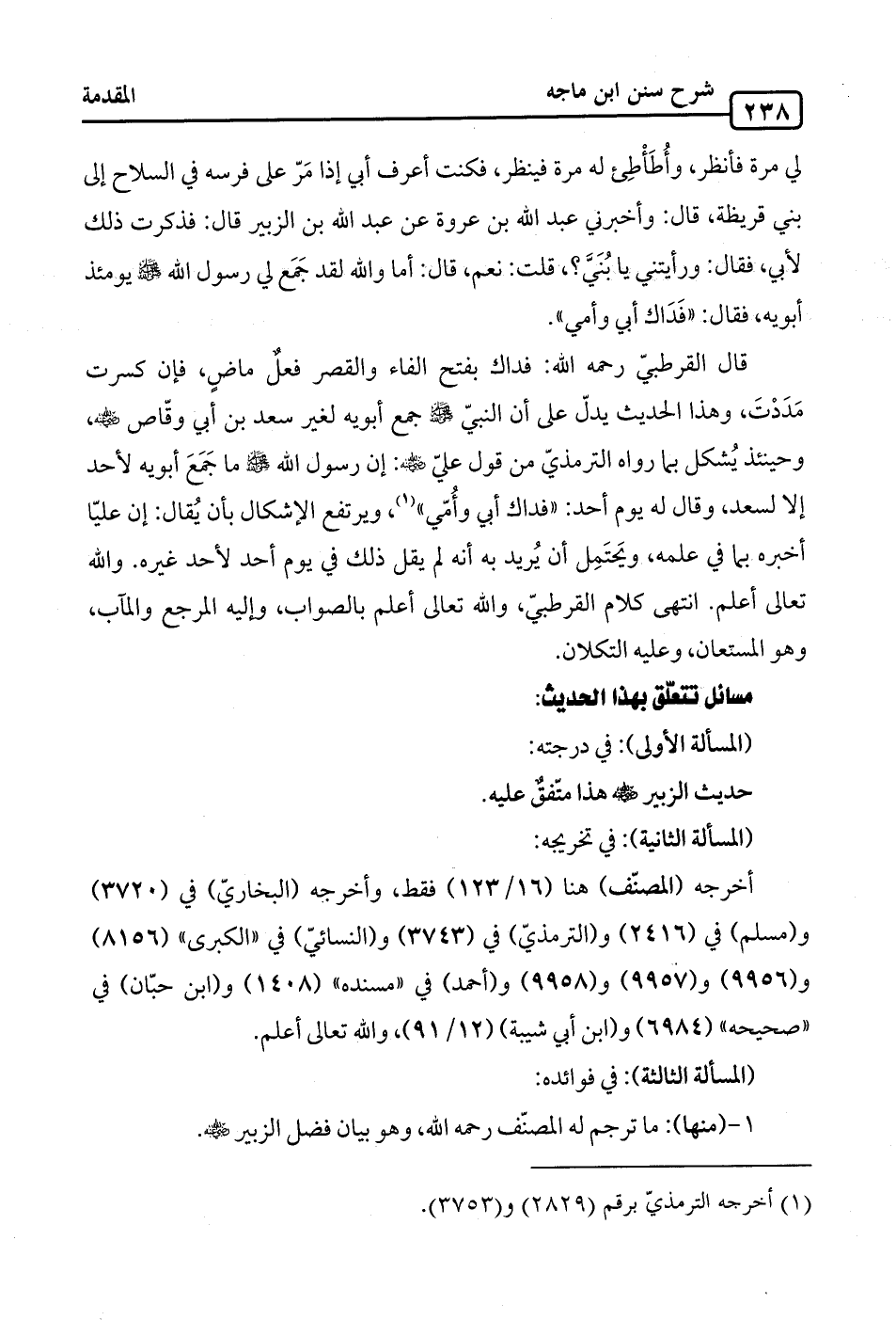 لي مرّة فأنظر، وأُطَأْطِئ له مرّة فينظر، فكنت أعرف أبي إذا مَرّ على فرسه في السلاح إلى بني قريظة، قال: وأخبرني عبد الله بن عروة عن عبد الله بن الزُّبير قال: فذكرت ذلك لأبي، فقال: ورأيتني يا بُنَيَّ؟، قلت: نعم، قال: أما والله لقد جَمَع لي رسول الله -صلى الله عليه وسلم- يومئذ أبويه، فقال: "فَدَاك أبي وأمي".