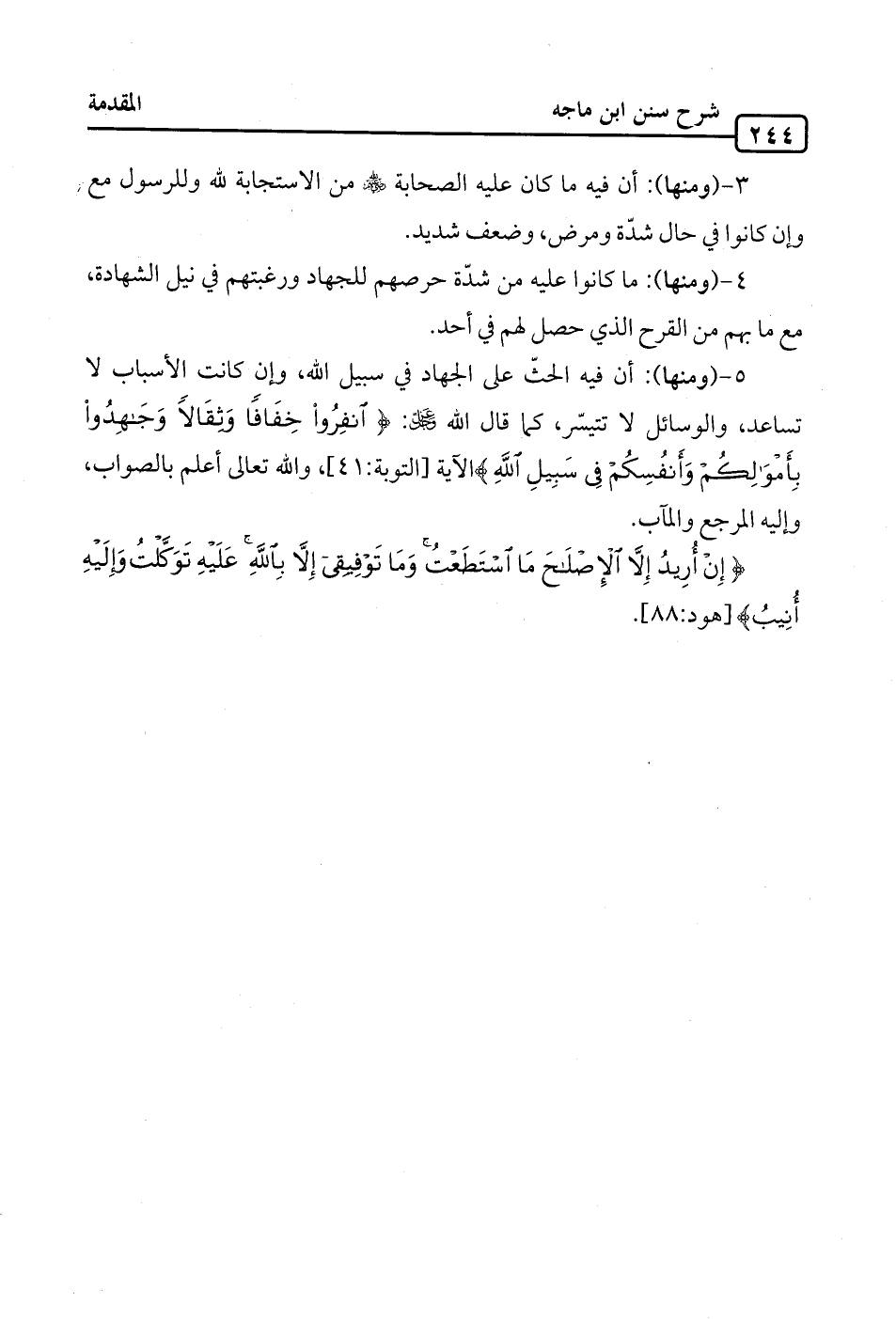 5 - (ومنها): أن فيه الحثّ على الجهاد في سبيل الله، وإن كانت الأسباب لا تساعد، والوسائل لا تتيسّر، كما قال الله -عَزَّ وَجَلَّ-: {انْفِرُوا خِفَافًا وَثِقَالًا وَجَاهِدُوا بِأَمْوَالِكُمْ وَأَنْفُسِكُمْ في سَبِيلِ اللَّهِ} الآية [التوبة: 41]، والله تعالى أعلم بالصواب، وإليه المرجع والمآب.