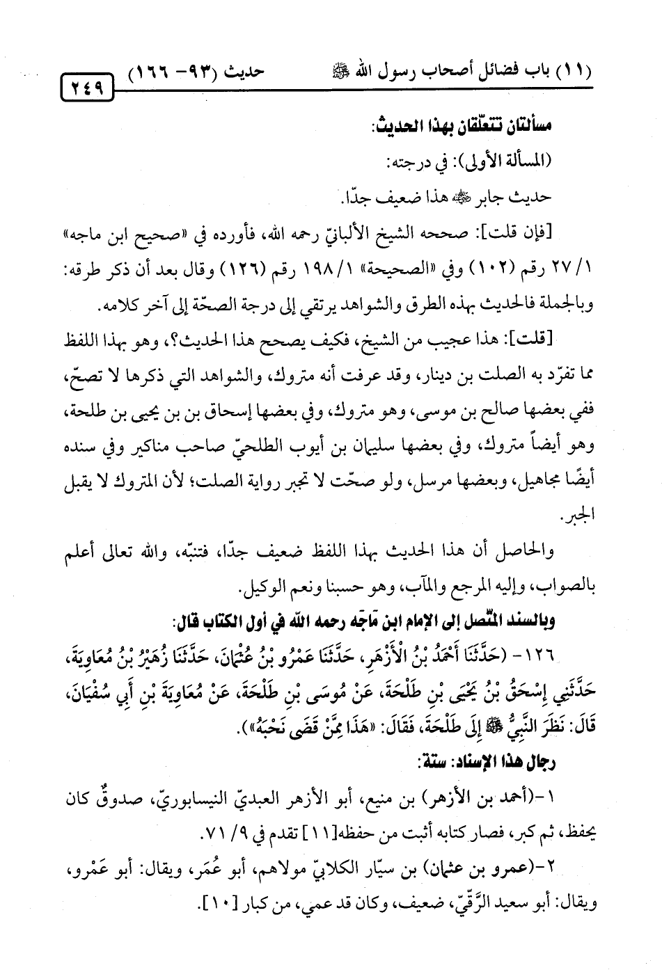 [قلت]: هذا عجيب من الشّيخ، فكيف يصحح هذا الحديث؟، وهو بهذا اللّفظ ممّا تفرّد به الصلت بن دينار، وقد عرفت أنه متروك، والشواهد الّتي ذكرها لا تصحّ، ففي بعضها صالح بن موسى، وهو متروك، وفي بعضها إسحاق بن بن يحيى بن طلحة، وهو أيضًا متروك، وفي بعضها سليمان بن أَيّوب الطلحيّ صاحب مناكير وفي سنده أيضًا مجاهل، وبعضها مرسل، ولو صحّت لا تجبر رواية الصلت؛ لأن المتروك لا يقبل الجبر.