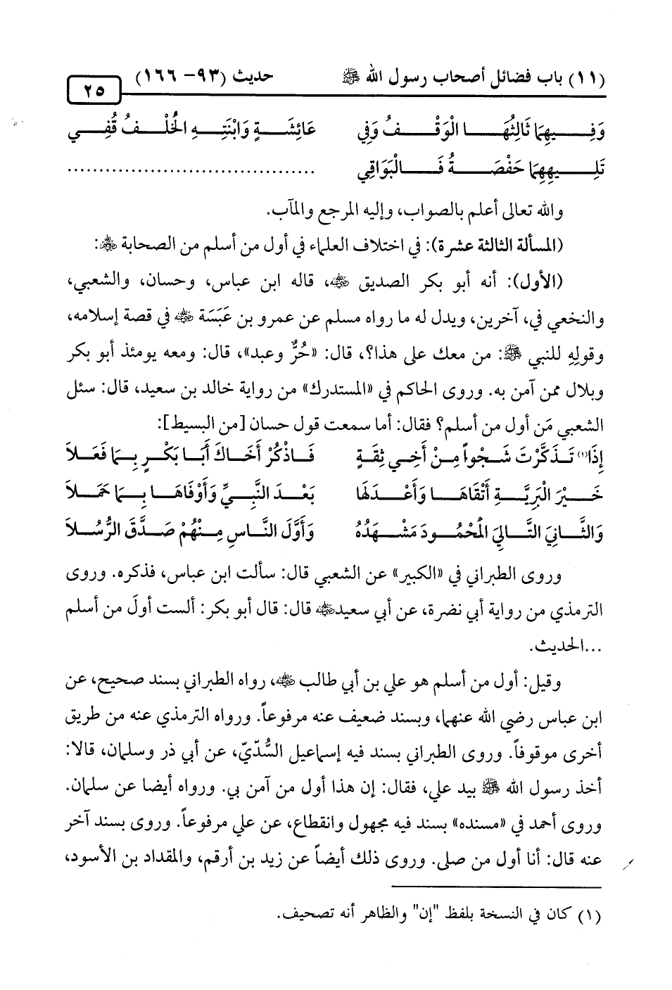 (الأول): أنه أبو بكر الصديق -رضي الله عنه-، قاله ابن عباس، وحسان، والشعبي، والنخعي في، آخرين، ويدل له ما رواه مسلم عن عمرو بن عَبَسَة -رضي الله عنه- في قصة إسلامه، وقولِهِ للنبي -صلى الله عليه وسلم-: من معك على هذا؟، قال: "حُرٌّ وعبد"، قال: ومعه يومئذ أبو بكر وبلال ممن آمن به. وروى الحاكم في "المستدرك" من رواية خالد بن سعيد، قال: سئل الشعبي مَن أول من أسلم؟ فقال: أما سمعت قول حسان [من البسيط]: