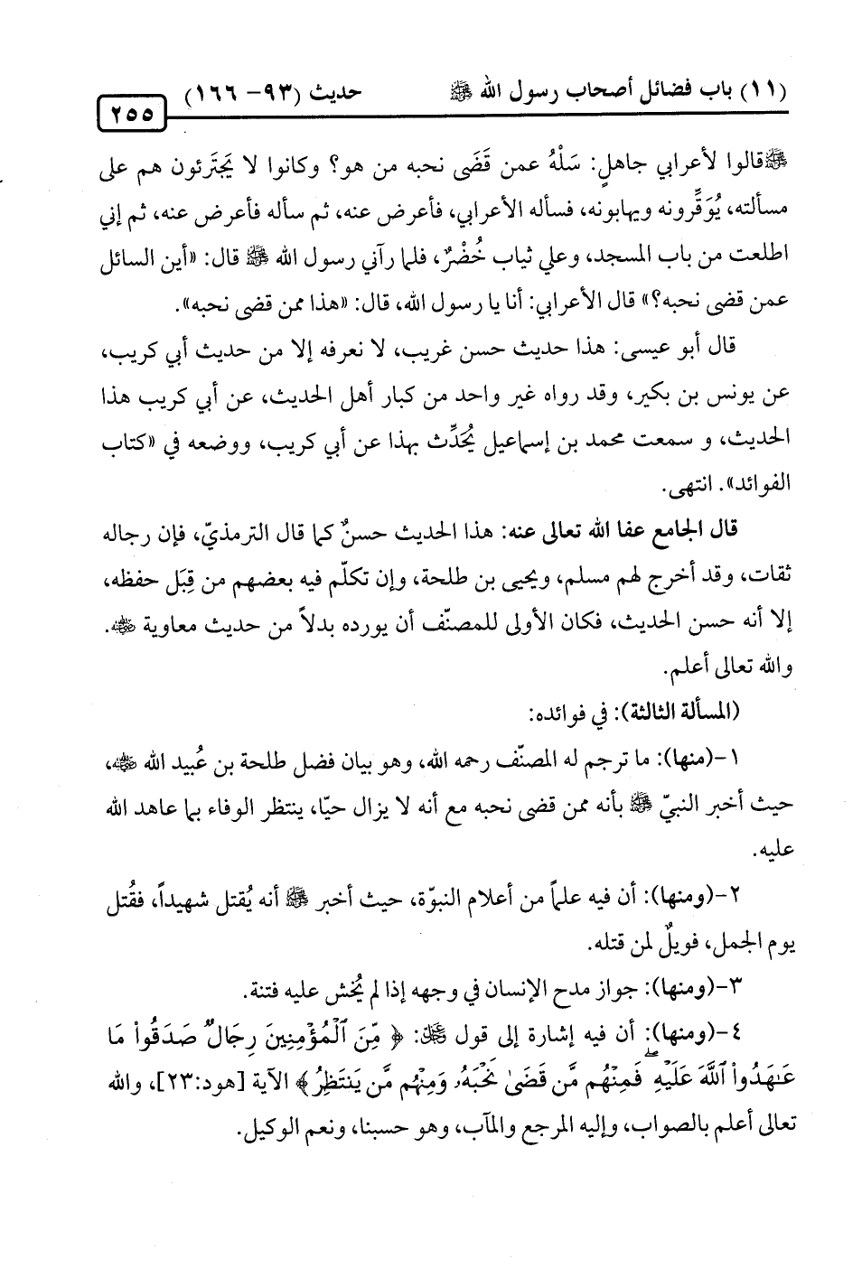 -رضي الله عنه- قالوا لأعرابي جاهلٍ: سلْهُ عمن قَضَى نحبه من هو؟ وكانوا لا يَجتَرئون هم على مسألته، يُوَقِّرونه ويهابونه، فسأله الأعرابي، فأعرض عنه، ثمّ سأله فأعرض عنه، ثمّ إنِّي اطلعت من باب المسجد، وعلي ثياب خُضْرٌ، فلما رآني رسول الله - صلّى الله عليه وسلم - قال: "أين السائل عمن قضى نحبه؟ " قال الأعرابي: أنا يا رسول الله، قال: "هذا ممّن قضى نحبه".