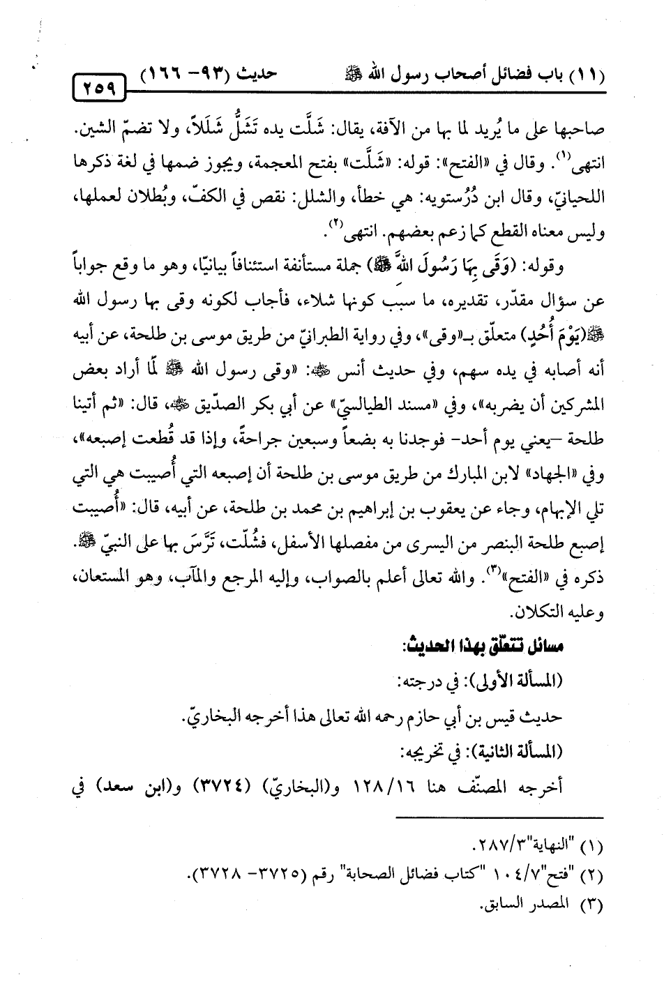 وقوله: (وَقَى بِهَا رَسُولَ الله -صلى الله عليه وسلم-) جملة مستأنفة استئنافًا بيانيًا، وهو ما وقع جوابًا عن سؤال مقدّر، تقديره، ما سبب كونها شلاء، فأجاب لكونه وقى بها رسول الله -صلى الله عليه وسلم- (يَوْمَ أُحُدٍ) متعلّق بـ "وقى"، وفي رواية الطبرانيّ من طريق موسى بن طلحة، عن أبيه أنه أصابه في يده سهم، وفي حديث أنس -رضي الله عنه-: "وقى رسول الله -صلى الله عليه وسلم- لمّا أراد بعض المشركين أن يضربه"، وفي "مسند الطيالسيّ" عن أبي بكر الصدّيق -رضي الله عنه-، قال: "ثمّ أتينا طلحة -يعني يوم أحد- فوجدنا به بضعًا وسبعين جراحةً، وإذا قد قُطعت إصبعه"، وفي "الجهاد" لابن المبارك من طريق موسى بن طلحة أن إصبعه الّتي أُصيبت هي الّتي تلي الإبهام، وجاء عن يعقوب بن إبراهيم بن محمّد بن طلحة، عن أبيه، قال: "أُصيبت إصبع طلحة البنصر من اليسرى من مفصلها الأسفل، فشُلّت، تَرَّسَ بها على النبيّ -صلى الله عليه وسلم-. ذكره في "الفتح" (¬3). والله تعالى أعلم بالصواب، وإليه المرجع والمآب، وهو المستعان، وعليه التكلان.