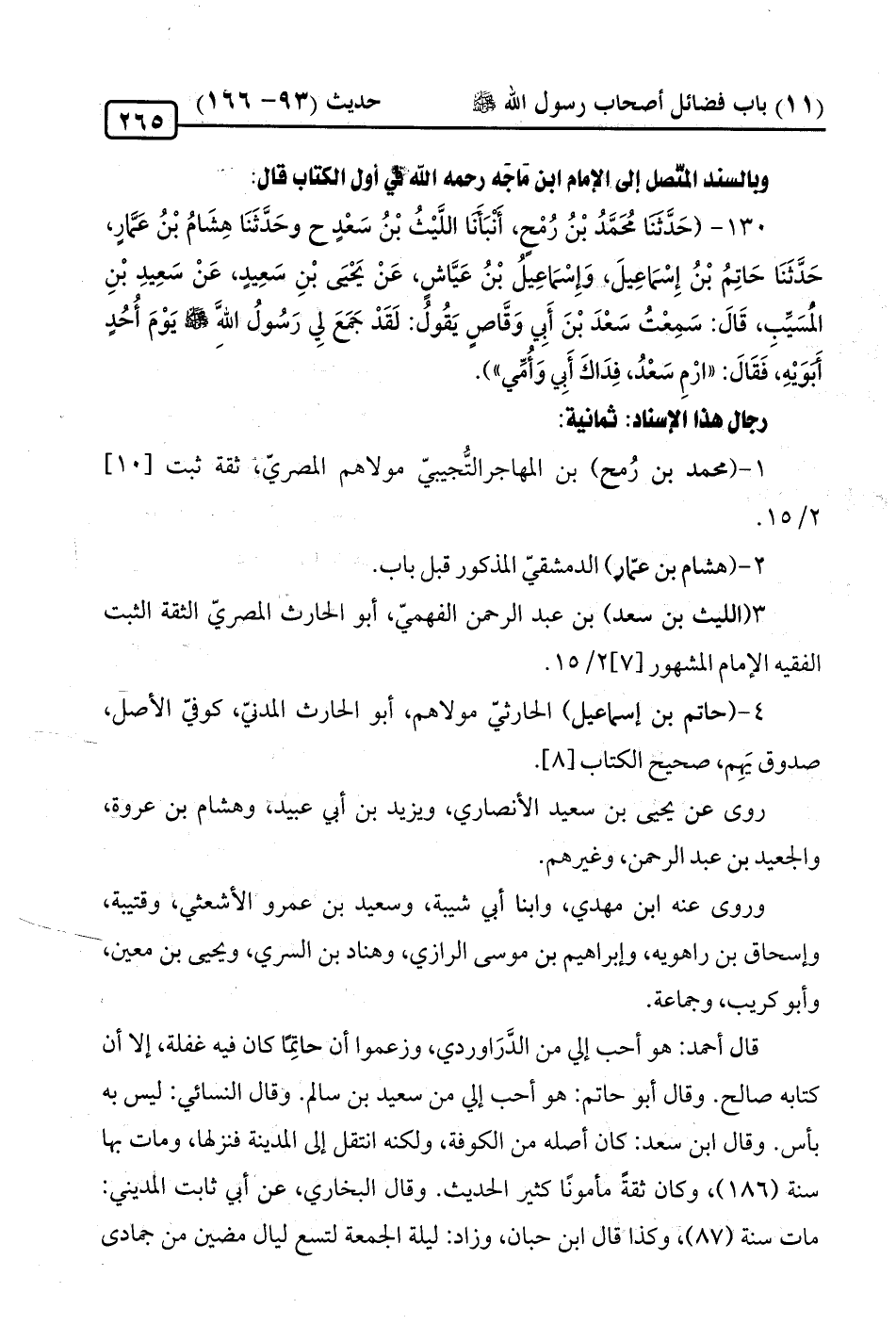130 - (حَدَّثنَا مُحَمَّدُ بْنُ رُمْح، أَنْبَأَنَا اللِّيْثُ بْنُ سَعْدٍ ح وحَدَّثَنَا هِشَامُ بْنُ عَمَّارٍ، حَدَّثَنَا حَاتِمُ بْنُ إِسْمَاعِيلَ، وَإِسماعِيلُ بْنُ عَيَّاشٍ، عَنْ يَحْيىَ بْنِ سَعِيدٍ، عَنْ سَعِيدِ بْنِ المُسَيِّبِ، قَالَ: سَمِعْتُ سَعْدَ بْنَ أَبِي وَقَّاصٍ يَقُوُل: لَقَدْ جَمَعَ لِي رَسُولُ الله -صلى الله عليه وسلم- يَوْمَ أُحُدٍ أَبَوَيْهِ، فَقَالَ: "ارْمِ سَعْدُ، فِدَاكَ أَبِي وَأُمِّي").