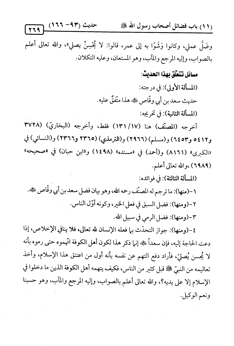 4 - (ومنها): جواز التحدّث بما فعله الإنسان لله تعالى؛ فلا ينافي الإخلاص، إذا دعت الحاجة إليه، فإن سعدًا -رضي الله عنه- إنّما ذكر هذا لكون أهل الكوفة اتّهموه حتّى رموه بأنه لا يُحسن يُصلّي، فأراد دفع التهم عن نفسه بأنه أول من أعتنق هذا الإسلام، وأخذ تعاليمه من النبيّ -صلى الله عليه وسلم- قبل كثير من النَّاس، فكيف يتهمه أهل الكوفة الذين ما دخلوا في الإسلام إِلَّا على يديه؟، والله تعالى أعلم بالصواب، وإليه المرجع والمآب، وهو حسبنا ونعم الوكيل.