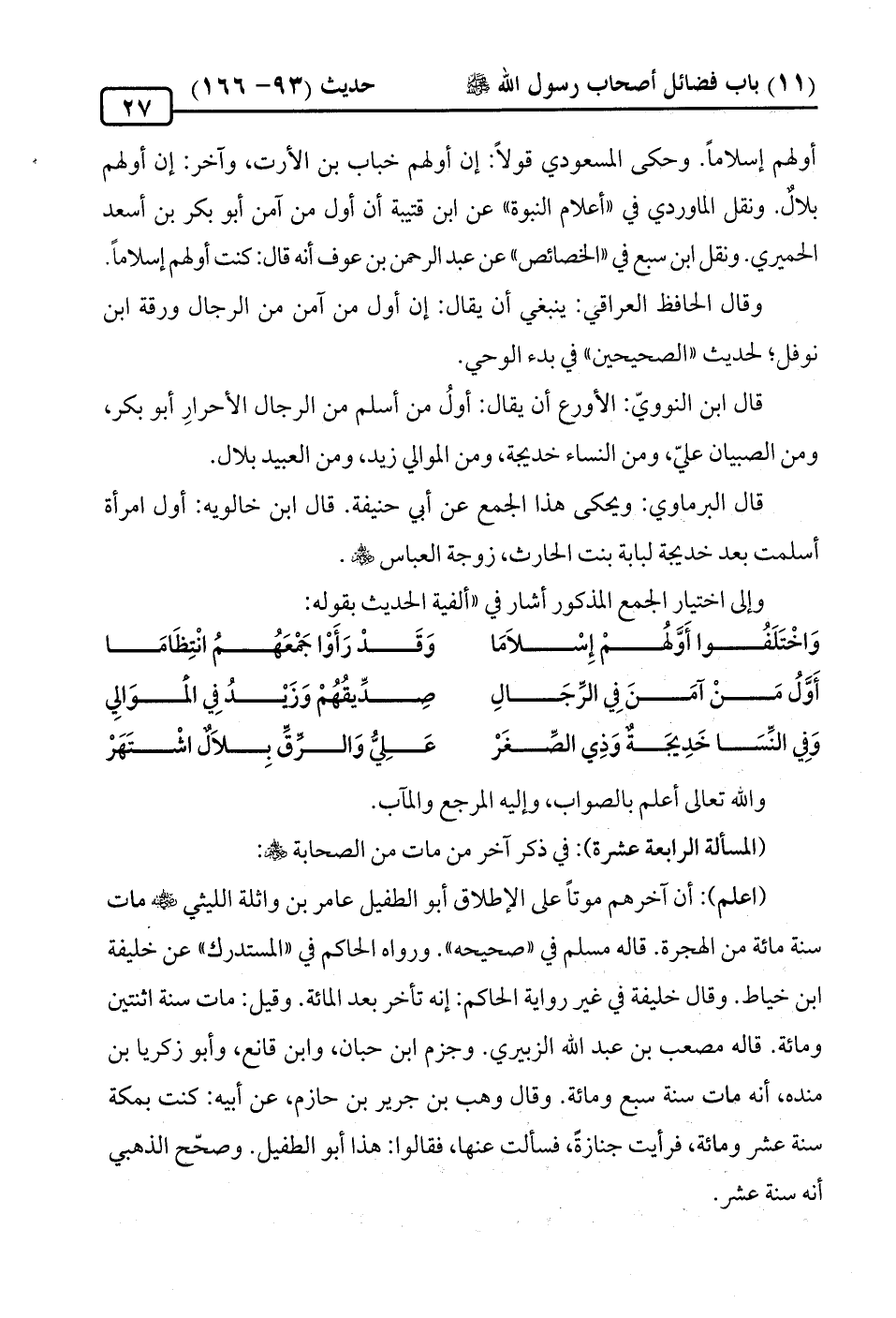 وَفي النِّسَا خَدِيجَةٌ وَذِي الصِّغَرْ ... عَليُّ وَالرِّقِّ بِلاَلٌ اشْتَهَرْ
