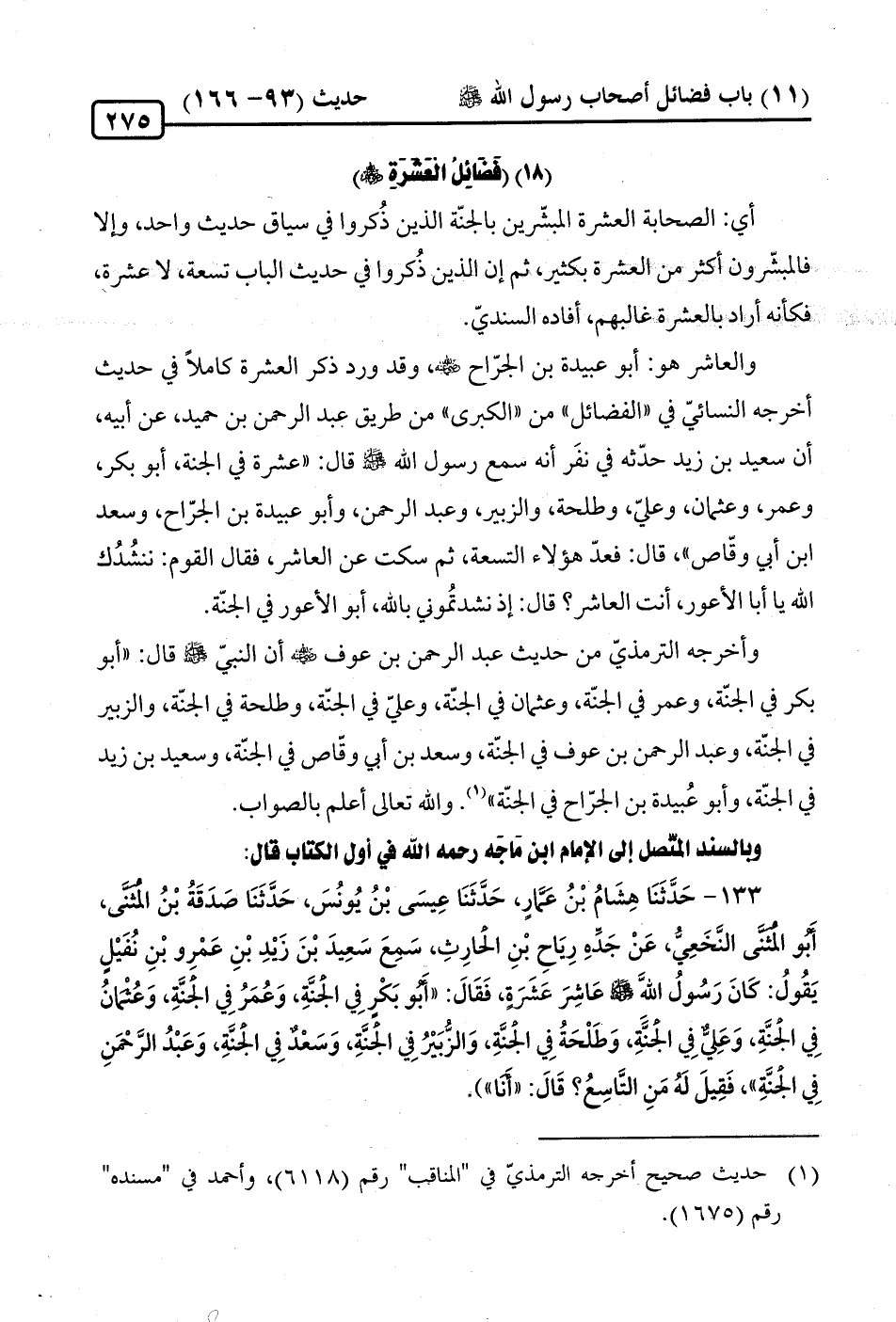 133 - حَدَّثَنَا هِشَامُ بْنُ عَمَّار، حَدَّثَنَا عِيسَى بْنُ يُونُسَ، حَدَّثَنَا صَدَقَةُ بْنُ المُثَنَّى، أَبُو المُثّنَّى النَّخَعِيُّ، عَنْ جَدِّهِ رِيَاحِ بْنِ الحارِثِ، سَمِعَ سَعِيدَ بْنَ زَيْدِ بْنِ عَمْرِو بْنِ نفيْلٍ يَقُولُ: كَانَ رَسُولُ الله -صلى الله عليه وسلم- عَاشِرَ عَشَرَةٍ، فَقَالَ: "أَبُو بَكْرٍ في الجنَّةِ، وَعُمَرُ في الجنَّةِ، وَعُثْمانُ في الجنَّةِ، وَعَليٌّ في الجنّةِ، وَطَلْحَةُ في الجنَّةِ، وَالزُّبَيْرُ قِي الجنَّةِ، وَسَعْدٌ في الْجَنَّةِ، وَعَبْدُ الرَّحْمَنِ في الجنَّةِ"، فَقِيلَ لَهُ مَنِ التَّاسِعُ؟ قَالَ: "أَنَا").