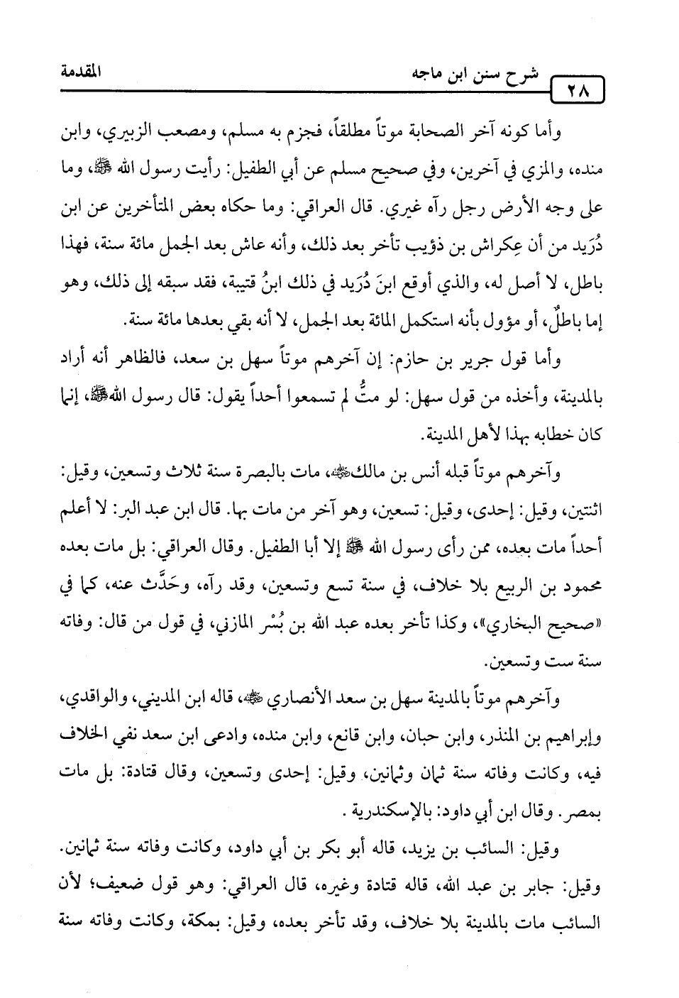وآخرهم موتًا قبله أنس بن مالك -رضي الله عنه-، مات بالبصرة سنة ثلاث وتسعين، وقيل: اثنتين، وقيل: إحدى، وقيل: تسعين، وهو آخر من مات بها. قال ابن عبد البر: لا أعلم أحدًا مات بعده، ممن رأى رسول الله -صلى الله عليه وسلم- إلا أبا الطفيل. وقال العراقي: بل مات بعده محمود بن الربيع بلا خلاف، في سنة تسع وتسعين، وقد رآه، وحَدَّث عنه، كما في "صحيح البخاري"، وكذا تأخر بعده عبد الله بن بُسْر المازني، في قول من قال: وفاته سنة ست وتسعين.
